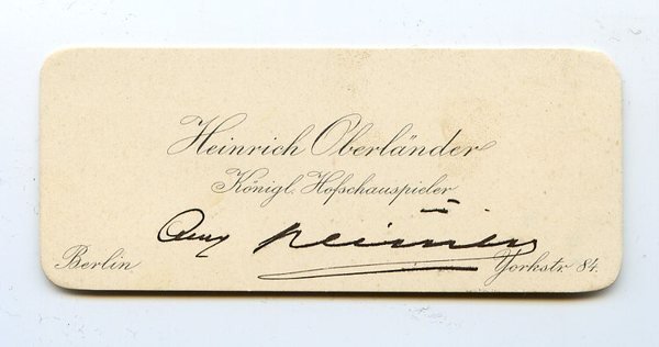 1 S. Visitkartenformat. Auf einer Visitenkarte des Schauspielers Heinrich Oberländer (1834-1911). - Der in Altona geborene Schauspieler gehörte seit 1885 dem Ensemble des Wiener Hofburgtheaters an und wurde 1890 zum Hofschauspieler ernannt. "Zu einem großen runden Geburtstag hatten wir uns alle auf der Burgtheaterbühne versammelt; die Nazizeit warf ihre Schatten voraus, und ein Professor der Germanistik feierte Georg Reimers als einen großen deutschen Schauspieler. Österreich kam in dieser Laudatio schlechtweg nicht vor. Der nächste Redner war damals Ernst Lothar. Er hatte ein vorbereitetes Manuskript, das er während der politischen Ansprache seines Vorredners kaum merklich zerriß. Lothar sprach frei und feierte den Österreicher Georg Reimers. 'Du warst', so sagte er, 'ein Schauspieler dieses Landes, dieser Stadt und dieses Hauses, und du warst mein Herr, wenn du meinen Diener spieltest, und immer ein Diener, wenn du auf der Bühne ein König warst'" (zit. n. Haeusserman, Das Wiener Burgtheater, Wien u. a., Molden, 1975, S. 95).