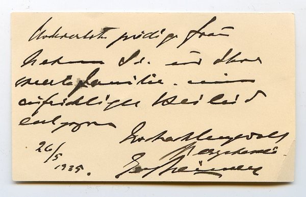 1 S. Visitkartenformat An eine namentlich nicht genannte Dame: "Nehmen Sie und Ihre werte Familie mein aufrichtiges Beileid entgegen [.]". - Der in Altona geborene Schauspieler gehörte seit 1885 dem Ensemble des Wiener Hofburgtheaters an und wurde 1890 zum Hofschauspieler ernannt. "Zu einem großen runden Geburtstag hatten wir uns alle auf der Burgtheaterbühne versammelt; die Nazizeit warf ihre Schatten voraus, und ein Professor der Germanistik feierte Georg Reimers als einen großen deutschen Schauspieler. Österreich kam in dieser Laudatio schlechtweg nicht vor. Der nächste Redner war damals Ernst Lothar. Er hatte ein vorbereitetes Manuskript, das er während der politischen Ansprache seines Vorredners kaum merklich zerriß. Lothar sprach frei und feierte den Österreicher Georg Reimers. 'Du warst', so sagte er, 'ein Schauspieler dieses Landes, dieser Stadt und dieses Hauses, und du warst mein Herr, wenn du meinen Diener spieltest, und immer ein Diener, wenn du auf der Bühne ein König warst'" (zit. n. Haeusserman, Das Wiener Burgtheater, Wien u. a., Molden, 1975, S. 95).