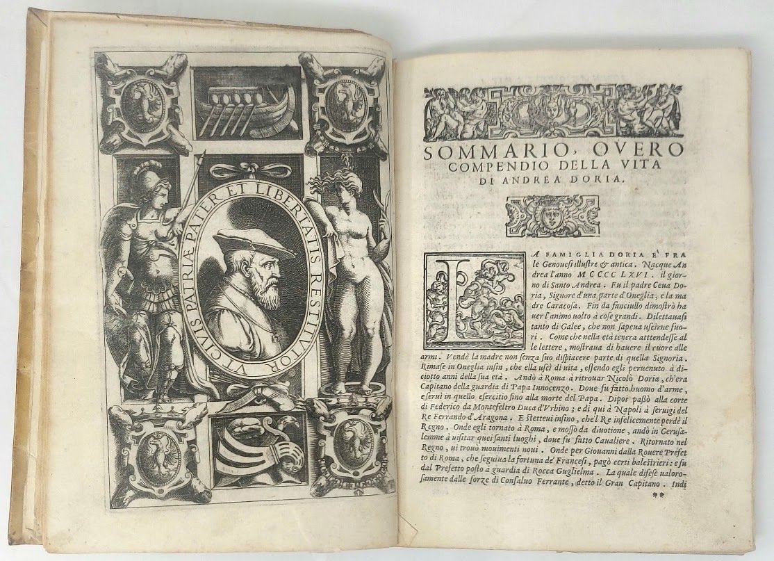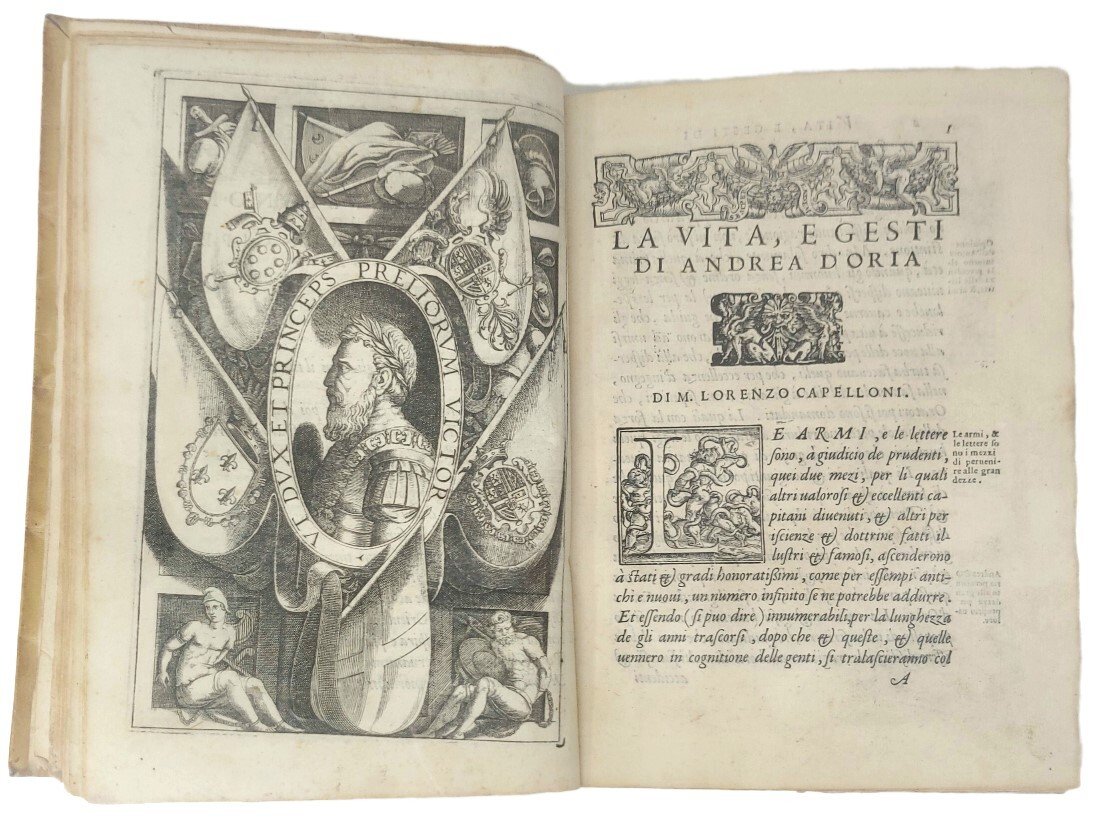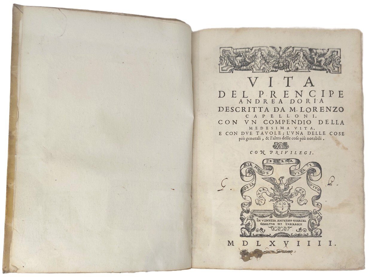 >in-4 (205x150 mm), pp. (24, compresi due tavole calcografiche a piena pag. con ritratti del Doria entro ovale e circondati da trofei ed emblemi, il tutto finemente inciso in rame), 188, (2, con registro e al verso impresa del Giolito); iniziali istoriate, testatine e finalini, impresa tipografica al titolo ed in fine, caratteri corsivo e romano. Legatura coeva in pergamena floscia, titolo manoscritto al dorso. Seconda edizione, molto più rara della prima del 1565, di questo trattato encomiastico, una sorta di panegirico, dedicato ad Andrea Doria. I due ritratti raffigurano Andrea Doria sia come cittadino e padre della patria (con veste e berretta) sia come capitano e vincitore di battaglie (loricato e laureato). Il Capelloni (1510-1590) fu storico al servizio della famiglia Doria. "Il Fontanini e dietro di lui l'Haym, tacendo della prima del 1565, citarono questa seconda edizione, che per essere senza paragone più rara, quasi mai si incontra nei cataloghi" (Annali Giolito, II 287). Andrea Doria (1466 - 1560), condottiero, politico e ammiraglio, ebbe una vita straordinariamente lunga e densa di significativi fatti storici a cavallo tra il Quattrocento e il Cinquecento italiano. Buon esemplare, antica nota di possesso ms. al titolo cassata, alcune tracce di polvere al frontespizio. Annali Giolito, II 287. Adams C-587, prima edizione. BMC 145.