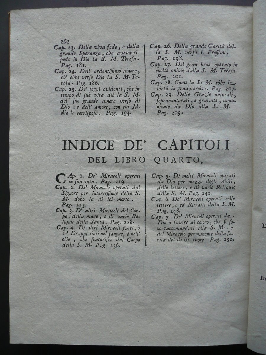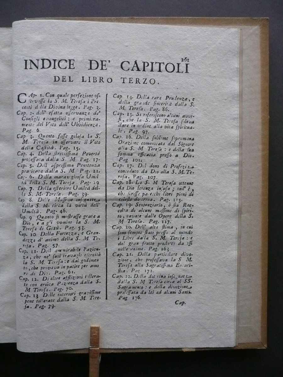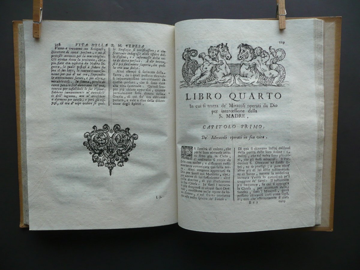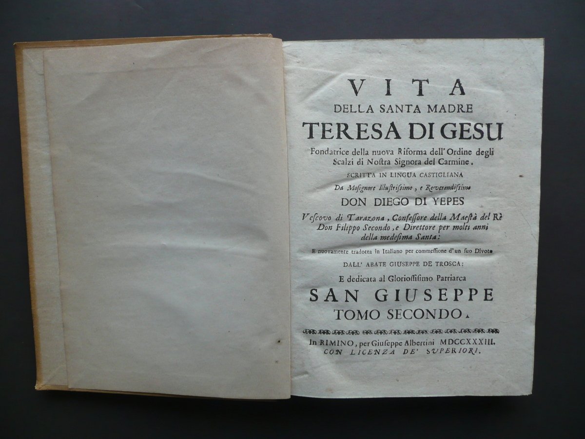 Settecentina, Vita della Santa Madre Teresa di Gesù Fondatrice della nuova Riforma dell'Ordine degli Scalzi di Nostra Signora del Carmine Scritta in lingua castigliana da Monsignore Illustrissimo, e Reverendissimo Don Diego di Yepes Vescovo di Tarazona, Confessore della Maestà del Re Don Filippo Secondo, e Direttore per molti anni della medesima Santa [.] Tomo Secondo Per Giuseppe Albertini, in Rimino 1733, cm 25x18,5, pp. 262; [1], con alcuni bei capilettera, testatine e chiusure incise, testo su due colonne; legatura primonovecentesca in cartonato con effetto similpergamena. Solo tomo II. Condizioni di conservazione Esemplare in buone condizioni con tracce d'uso, margine inf. del piatto post. con una minima ammaccatura, dorso con qualche piccola lievissima abrasione, cuffia sup. con minimi strappetti e mancanze. Interni buoni, complessivamente molto ben conservati, margine est. delle pp. 240-241 con una minuscola mancanza che non interessa il testo. Solo volume II (l'ultimo). Tale volume comprende il libro quarto, ovvero quello dedicato ai miracoli compiuti dalla Santa in vita, dopo la sua morte e attraverso le sue reliquie. SETT84.L7420 N