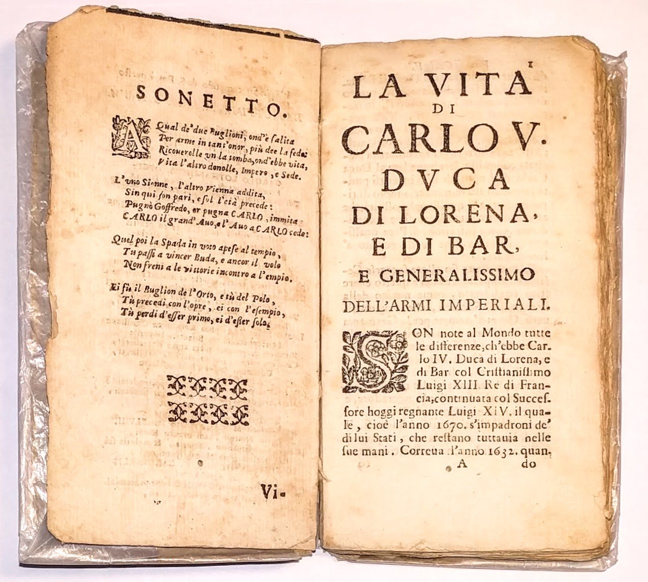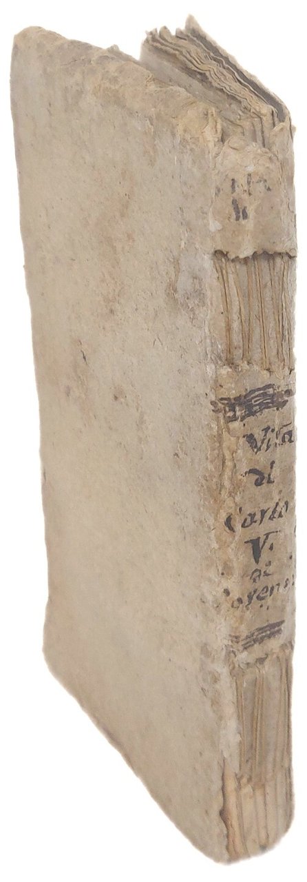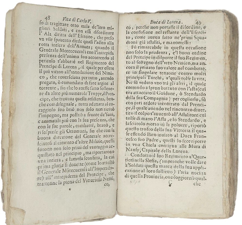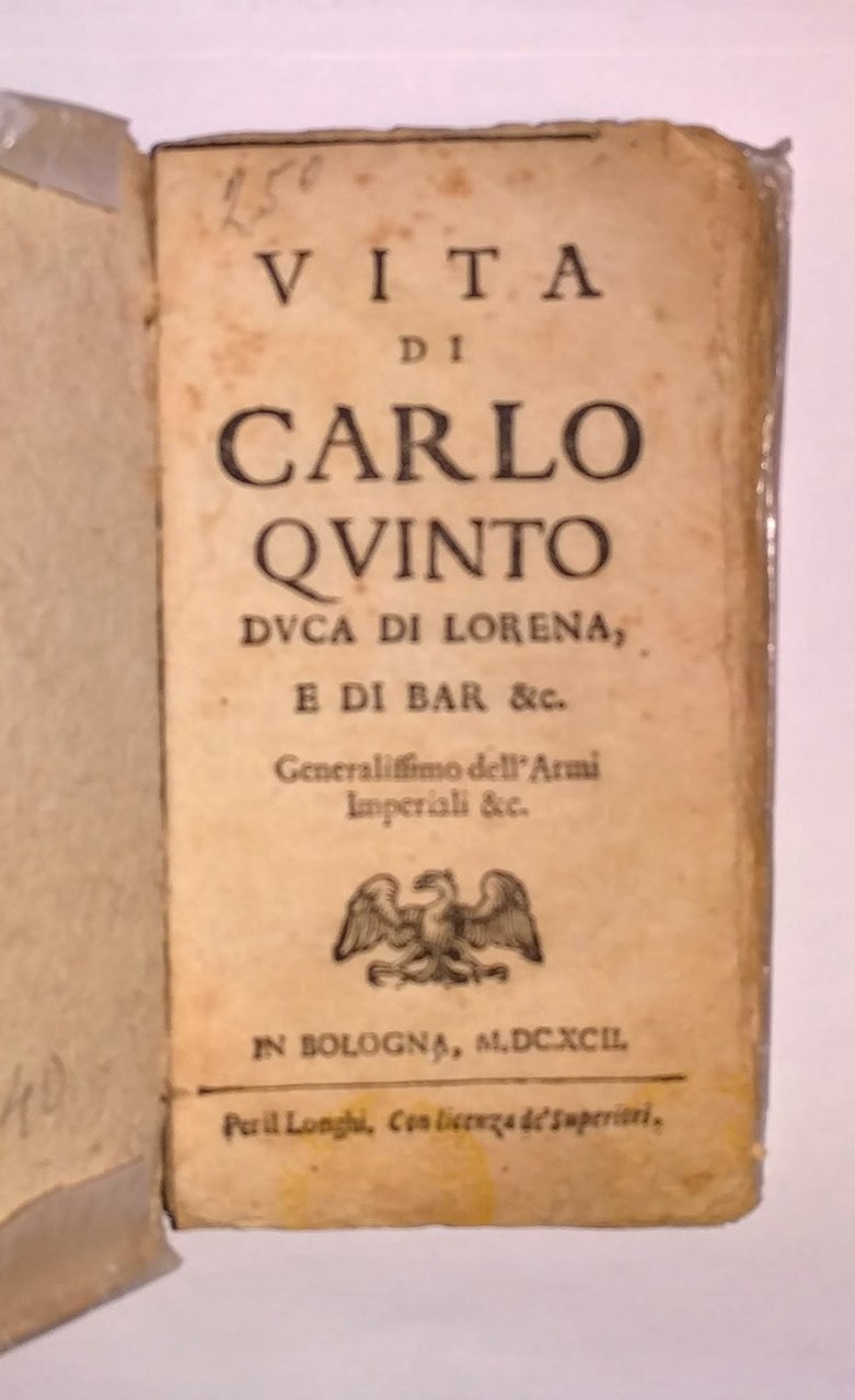 >in-12 (145x75 mm), pp. (8), 184, legatura in cartone coevo, titolo ms. al dorso (con mancanze). Interessante biografia pressocché contemporanea (Carlo V morì nel 1690), prima traduzione italiana dell'opera di Casimir Freschot, in questa rarissima (due esemplari censiti da biblioteche italiane) edizione bolognese impressa senza indicazioni d'autore. La paternità si evince dall'edizione successiva, (Bologna e Macerata per Gio. Battista e Girolamo Saffi, 1693 ), identica a questa, in cui invece l'Autore è palese. Buon esemplare, internamente assai fresco.