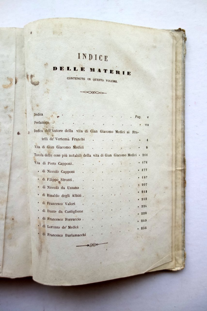 Marcantonio Missaglia, Vita di Giangiacomo Medici Marchese di Marignano - Vite di Celebri Italiani di Fr. Benedetti da Cortona con note di Massimo Fabi Francesco Colombo, Milano 1854; cm 18x12; pp. XII-268, con due tavv. inc. in b/n; legatura in cartonato coevo. Condizioni di conservazione Esemplare complessivamente in buone condizioni con tracce d'uso, coperta lievemente ondulata con alcuni aloni e abrasioni, parziale perdita dei fregi ai piatti e al dorso (vedi foto). Interni buoni con qualche piccola leggera brunitura, al frontespizio qualche segnetto a matita. SETT221.L21396 N