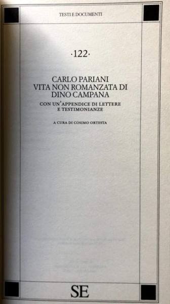 Pubblicato nel 1938, "Vita non romanzata di Dino Campana", dello psichiatra Carlo Pariani, che qui si propone con una ricca appendice di lettere e di testimonianze, è un documento utile per la conoscenza di uno dei più grandi poeti italiani del Novecento. Pariani incontrò Campana nel manicomio di Castel Pulci dove il poeta, lì ricoverato da anni, ebbe con lui una serie di colloqui tra la fine del 1926 e l'aprile del 1930. La loro trascrizione costituisce la parte centrale del libro, che l'autore concepì come uno studio dell'influenza della psicopatia sull'"ingegno e il carattere" del poeta. Negli anni successivi alla sua pubblicazione, i materiali contenuti nella Vita non romanzata furono utilizzati dagli studiosi secondo due direzioni ben distinte: o per studiare la personalità e la vita di Campana, o per individuare le occasioni e i momenti di nascita di alcuni testi dei Canti Orfici. Troppo scarso rilievo, invece, è stato dato a quelle parti dei colloqui in cui esplode il discorso "folle" di Campana. Una lettura libera e completa delle pagine di Pariani porterà invece a riconoscere, proprio nella compresenza e nell'intersecarsi di oscurità e chiarezza, di ragionevolezza e follia, il più impressionante valore documentario del libro e la sua più intensa carica di suggestione e di senso.