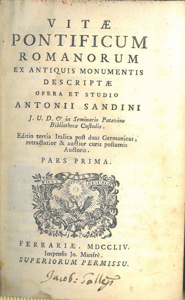 Vitae pontificum romanorum ex antiquis monumentis descriptae opera et studio Antonii Sandini J. U. D. et in seminario patavino bibliotheca. Editio tertia italica post duas germanicas retractatior & auctior curis postumis auctoris