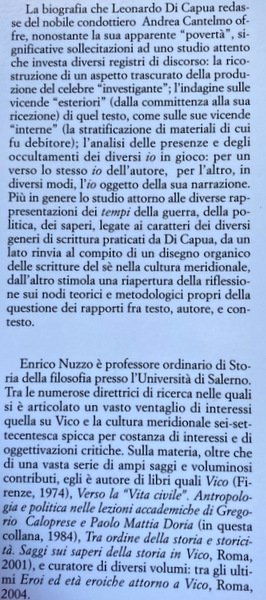I quaderni di "Studi Vichiani" si propongono, vichianamente, di essere un ideale luogo d'incontro tra filosofi, storici, eruditi, direttamente o indirettamente interessati alla comprensione di Vico, del suo significato nel pensiero moderno e delle influenze che ebbe sugli altri pensatori. Vite e scritti di Capitani di Enrico Nuzzo, biografia che Leonardo Di Capua redasse del nobile condottiero Andrea Cantelmo offre significativi spunti di riflessione: lo studio attorno alle diverse rappresentazioni dei tempi della guerra, della politica, dei saperi. Un ottimo testo per riflettere, per capire in fondo la storia della filosofia moderna.