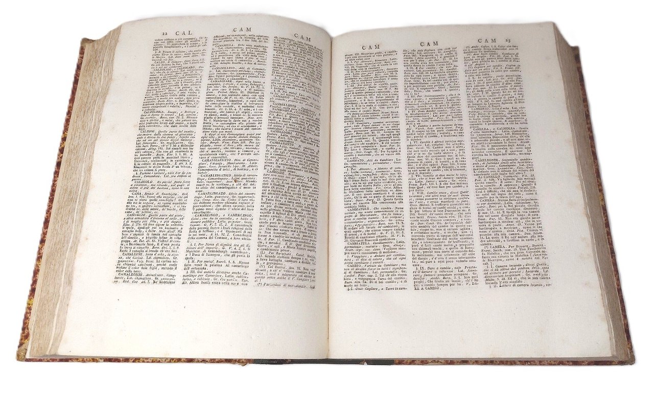 >7 vol. in 4 tomi in-4, testo su tre colonne, pp. XXXII, 409 (1); 531 (1); 518; 353 (1); 480; 554; 235 (1); 244 di ''Indice delle Voci e locuzioni latine''; 72 di ''Autori o Libri d'Autori del Buon Secolo''; 85, (1) di ''Vocabolario toscano dell'arte del disegno... di Filippo Baldinucci''; 165, (1) di ''Voci maniere di dire e osservazioni di toscani scrittori... raccolte e corredate di note da Andrea Pasta che possono servire a giovani nell arte del medicare...''. Ottima legatura coeva in m. pelle verde, titolo e filetti in oro al dorso. Pregiata edizione veronese del Vocabolario, capolavoro linguistico italiano, aggiornata ed accresciuta, assai rara a trovarsi completa di tutte le sue parti. Bell'esemplare, piuttosto fresco (piccolo restauro all'angolo inferiore bianco del margine dei primi dieci ff. del primo vol., ed altro al margine esterno ai primi 2ff. del sesto volume), consuete e lievi arrossature della carta qua e là. Gamba, n. 2815