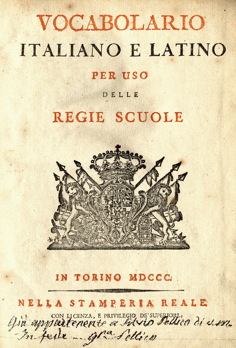 >2 vol. in-4 (mm 190x257), pp. XX, 766; XX, 784, legature coeve in piena pergamena, tagli rossi. Titoli in rosso e nero con armi di casa Savoia. Il secondo volume ha per titolo ''Vocabolario italiano e latino per uso delle Regie scuole''. Pregevole edizione di questo celebre vocabolario latino-italiano e italiano-latino. La fama di tale opera (prima ediz. Torino, Zappata 1731), anche oltre i confini piemontesi, è testimoniata dalle innumerevoli edizioni che se ne stamparono. Compilatori di tale importante lavoro furono il padovano G. Pasini (1687-1770), professore e bibliotecario dell'Università di Torino e Giuseppe Antonio Badia, lettore all'Università di medicina sempre a Torino. Importante esemplare appartenuto a Silvio Pellico, come si desume dalle note di possesso ai tit.: vol. I ''Attesto che il presente appartenne a mio fratello Silvio Pellico...In fede Giuseppina Pellico'' ed al vol. II ''Già appartenente a Silvio Pellico...In fede Giuseppina Pellico''. Buon esemplare con qualche fioritura. Melzi III, pp. 262-263.