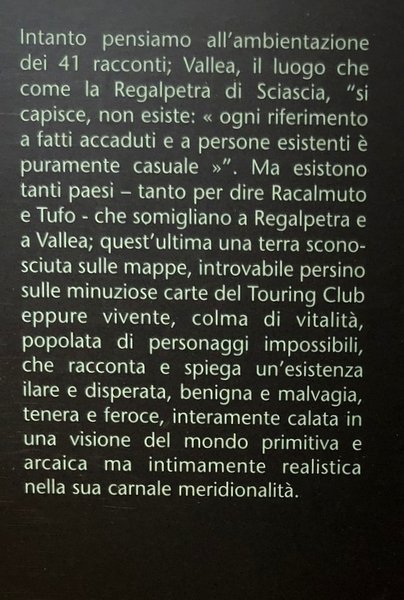 L’ambientazione dei 41 racconti è Vallea, il luogo che come la Regalpetra di Sciascia, “si capisce, non esiste: «ogni riferimento a fatti accaduti e a persone esistenti è puramente casuale»”. Ma esistono tanti paesi – tanto per dire Racalmuto e Tufo - che somigliano a Regalpetra e a Vallea; quest’ultima una terra sconosciuta sulle mappe, introvabile persino sulle minuziose carte del Touring Club eppure vivente, colma di vitalità, popolata di personaggi impossibili, che racconta e spiega un’esistenza ilare e disperata, benigna e malvagia, tenera e feroce, interamente calata in una visione del mondo primitiva e arcaica ma intimamente realistica nella sua carnale meridionalità.