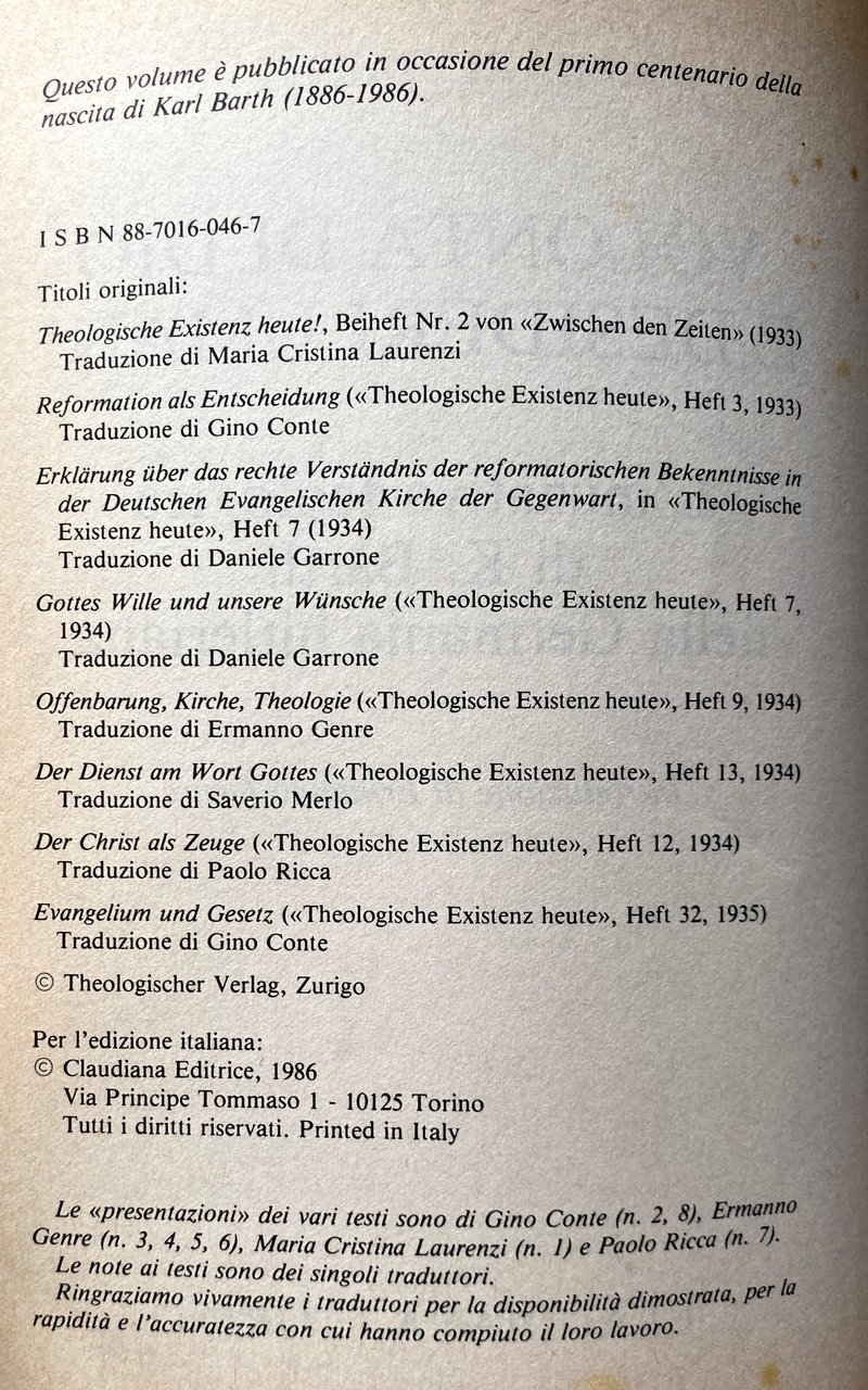 Theologische Existenz heute!, Beiheft Nr. 2 von Zwischen den Zeiten (1933). Traduzione di Maria Cristina Laurenzi