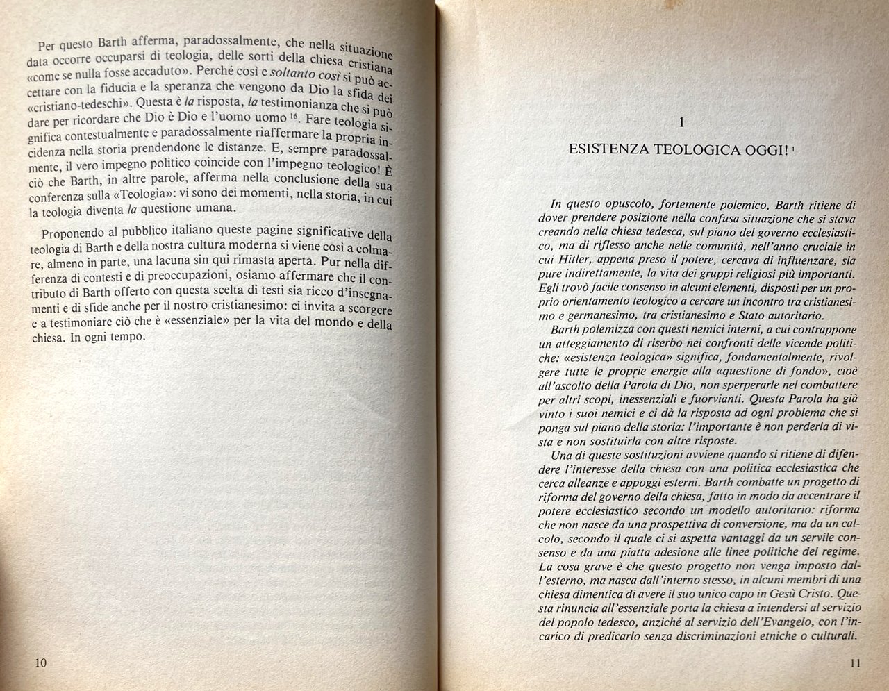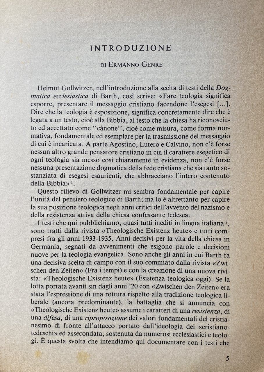 INTRODUZIONE: Helmut Gollwitzer, nell'introduzione alla scelta di testi della Dogmatica ecclesiastica di Barth, così scrive: Fare teologia significa esporre, presentare il messaggio cristiano facendone l'esegesi [...]. Dire che la teologia è esposizione, significa concretamente dire che è legata a un testo, cioè alla Bibbia, al testo che la chiesa ha riconosciuto ed accettato come canone, cioè come misura, come forma normativa, fondamentale ed esemplare per la trasmissione del messaggio di cui è incaricata. A parte Agostino, Lutero e Calvino, non c'è forse nessun altro grande pensatore cristiano in cui il carattere esegetico di ogni teologia sia messo così chiaramente in evidenza, non c'è forse nessuna presentazione dogmatica della fede cristiana che sia tanto so stanziata di esegesi esaurienti, che abbracciano l'intero contenuto della Bibbia. Questo rilievo di Gollwitzer mi sembra fondamentale per capire l'unità del pensiero teologico di Barth; ma lo è altrettanto per capire la sua posizione teologica negli anni critici dell'avvento del nazismo e della resistenza attiva della chiesa confessante tedesca.. I testi che qui pubblichiamo, quasi tutti inediti in lingua italiana, sono tratti dalla rivista Theologische Existenz heute e tutti compresi fra gli anni 1933-1935. Anni decisivi per la vita della chiesa in Germania, segnati da avvenimenti che esigono parole e decisioni nuove per la teologia evangelica. Sono anche gli anni in cui Barth fa una decisiva scelta di campo con il suo commiato dalla rivista Zwischen den Zeiten (Fra i tempi) e con la creazione di una nuova rivista: Theologische Existenz heute (Esistenza teologica oggi). Se la lotta portata avanti sin dagli anni '20 con Zwischen den Zeiten era stata l'espressione di una rottura rispetto alla tradizione teologica liberale (ancora predominante), la battaglia che si annuncia con Theologische Existenz heute assume i caratteri di una resistenza, di una difesa, di una riproposizione dei valori fondamentali del cristianesimo di fronte all'attacco portato dall'ideologia dei cristiano tedeschi ed assecondata, sostenuta da numerosi ecclesiastici e teologi. È questa svolta che intendiamo qui documentare con i testi che...