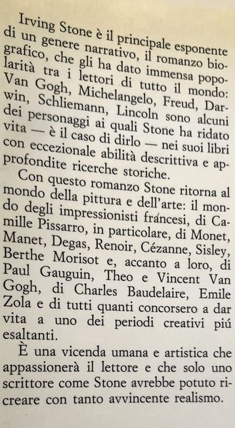 In un racconto appassionante e di avvincente realismo, Irving Stone ha ridato vita ai maggiori e minori esponenti dell’Impressionismo francese, ripercorrendo le vicende umane e artistiche di personalità d’eccezione. Al centro del libro è Camille Pissarro, il «visionario riflessivo», come fu definito, la cui vita è strettamente intrecciata a quella di Monet, Manet, Degas, Renoir, Cézanne, Sisley, Gauguin, Van Gogh, Baudelaire, Zola e quanti altri, pittori, scrittori, mercanti d’arte, popolarono la scena artistica francese nella seconda metà dell’Ottocento. Gli incontri al Café Guerbois e al Café de la Nouvelle Athène, le esposizioni ai Salons ufficiali, e ai Salons des refusés e, sullo sfondo, le vicende politiche della Francia a cavallo fra Secondo Impero e Terza Repubblica, fanno da cornice allo sviluppo di uno dei più esaltanti periodi creativi della storia dell’arte, narrato con fantasia e attenzione alla verità storica.