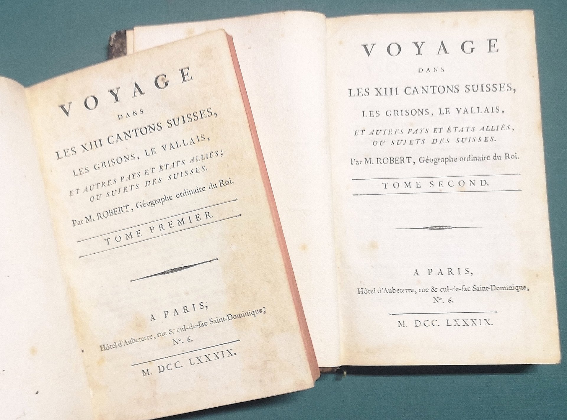 >2 voll. in-8, pp. VIII, 318; 397, (1) di errata. Legatura coeva in p. pelle, titoli in oro su tasselli al dorso, ornato da filetti e fregi in oro, tagli rossi. Dettagliato resoconto di viaggio in Svizzera. Ottimo esemplare, fresco e marginoso (lievi difetti alla legatura).