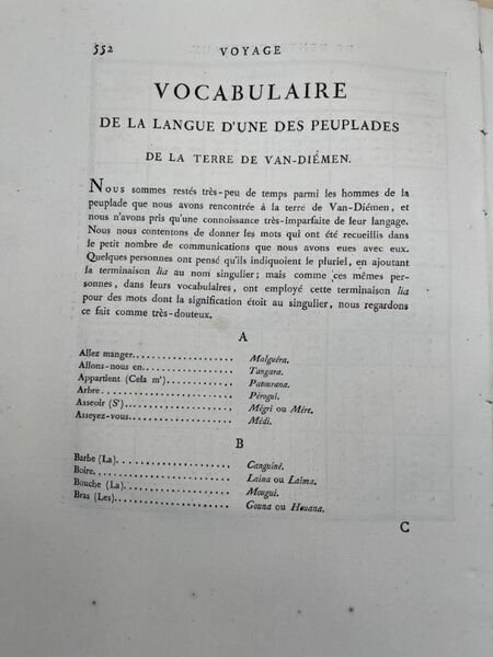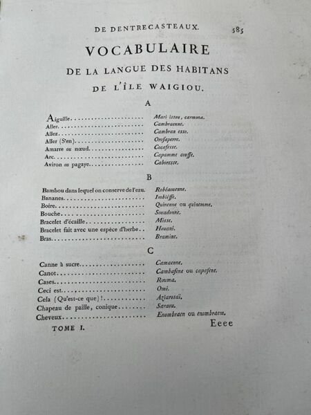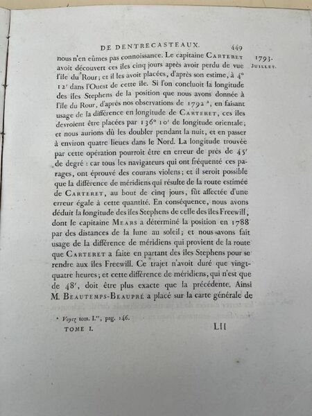 Imprimerie Impériale 1808 A Paris, de l'Imprimerie Impériale, 1808. Tome I seul, Un volume très fort In-folio, relié cartonnage d'attente de l'époque, LVI + 704 pages et 32 planches dépliantes. Le corps de l'ouvrage est en très bon état, les pages, à grandes marges ne sont ni tachées ni affectéees de rousseurs, imprimées sur beau papier. Les planches dépliantes sont également en bon état, présentant juste quelques petites pointes de rousseurs dans les marges sans gravité. La reliure (cartonnage d'attente) est en mauvais état. Rappelons que d'Entrecateaux avait été envoyé, en 1781) par Louis XVI à la recherche de La Pérouse