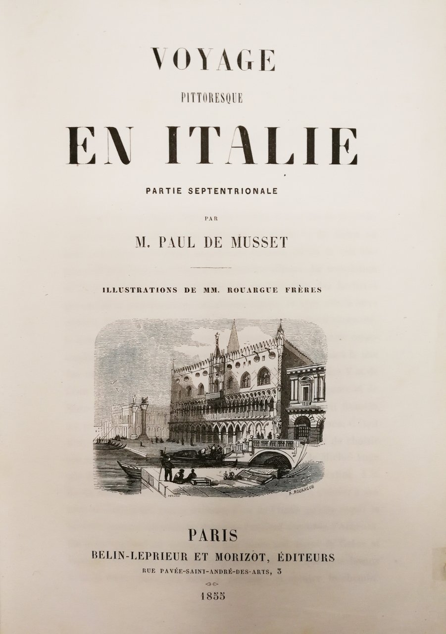 In-8 gr. (mm. 259x165), mezza pelle coeva, dorso a cordoni con decorazioni e titolo oro, tagli dorati, pp. VIII,544. L'opera e' molto ben illustrata da 23 tavole fuori testo, disegnate e inc. su acciaio dai F.lli Rouargue, di cui 6 sono colorate a mano e raffigurano tipici "mestieri" dell'epoca; le restanti sono vedute delle più pittoresche città dell'Italia Settentrionale. Considerate il suo capolavoro, queste "esperienze italiane" rimasero per lungo tempo l'introduzione più aggiornata ad un viaggio nella penisola. "Edizione originale.". Cfr. Fossati Bellani,I,560 - Brunet,VI,20189 - Carteret,III, p. 429 cita l'ediz. del 1864.Esemplare con fioriture.