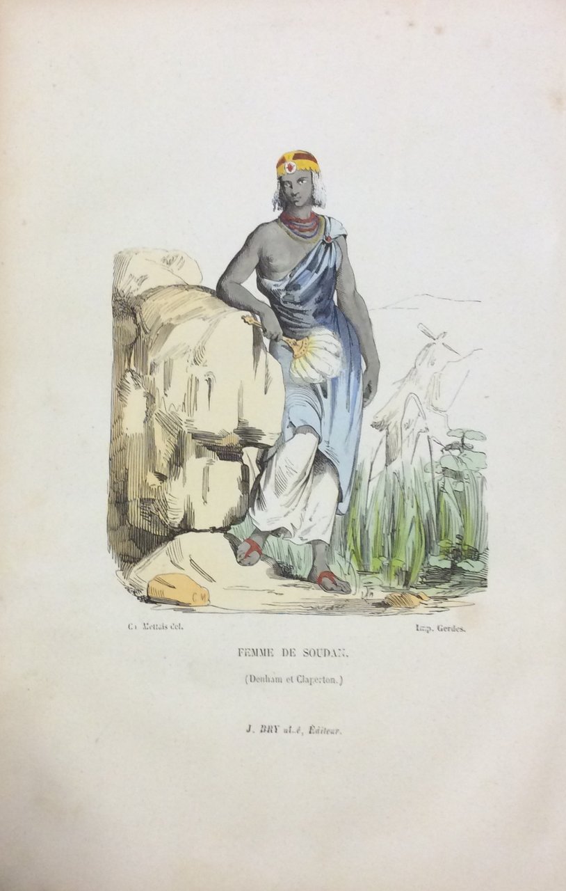 In-4 p. (mm. 282x184), cartonato muto coevo (con abras.), pp. complessive (4),320, molto ben illustrato nel testo (su due colonne) da numerose figure xilografate e, fuori testo, da 1 cartina geografica a colori e da 8 pregevoli tavole litografate a colori su disegni di Bocourt et Ch. Mettais, che raffigurano abitanti dei paesi visitati, nei costumi tradizionali. Brevi descrizioni di importanti viaggi realizzati in Africa, nel Sette e Ottocento, dai su indicati viaggiatori e anche da altri meno noti, qui riuniti in una interessante raccolta divisa in 11 parti. Con qualche arross. ma buon esemplare.