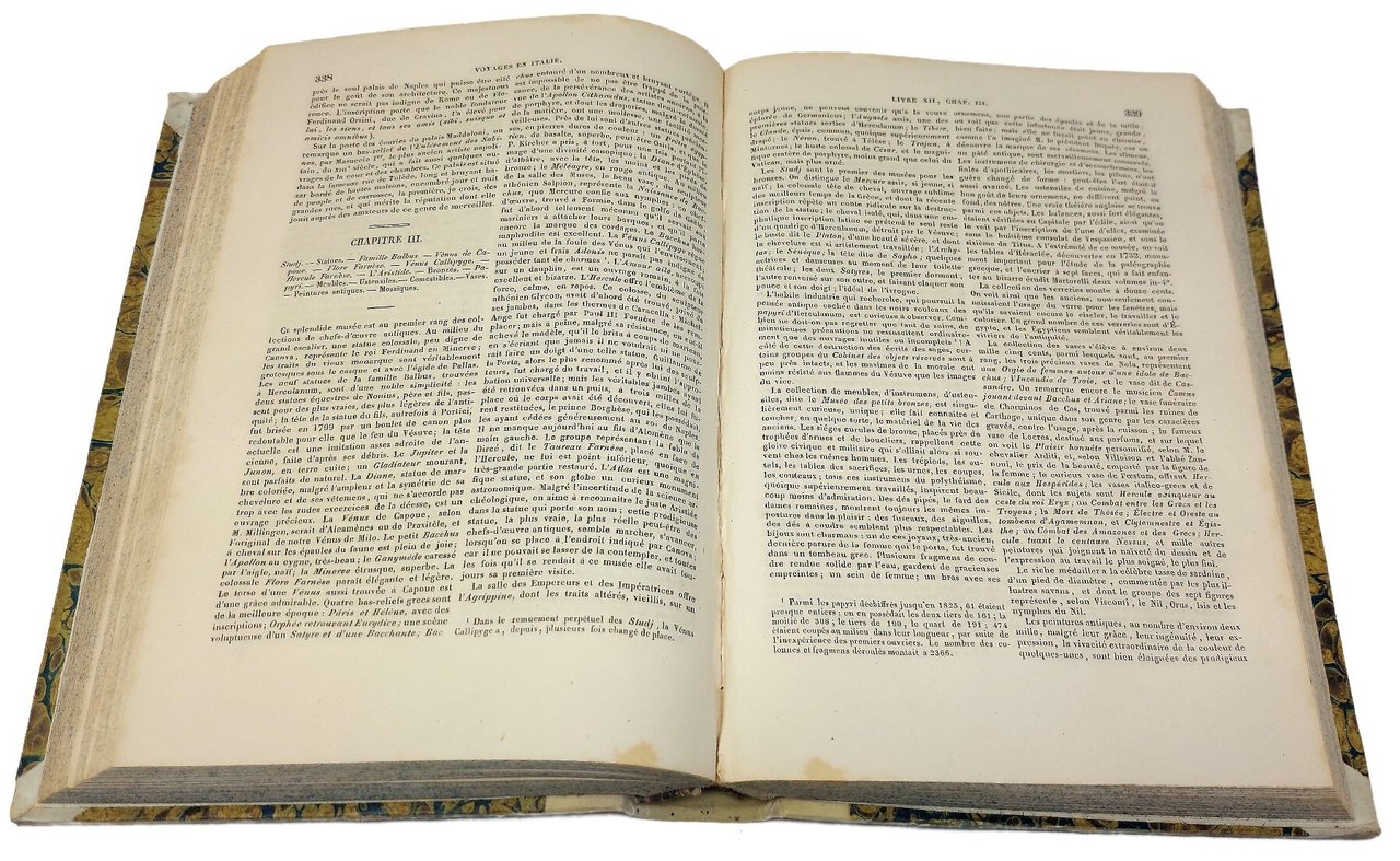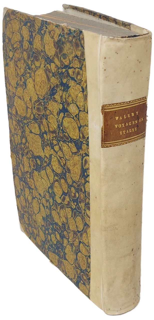 >in-4, pp. II, 606, legatura coeva in mezza pergamena e angoli, tassello granata al dorso. Seconda edizione di opera dettagliatissima sull'Italia peninsulare (prima ed. 1831-1833 in 5 volumi in-8), con particolare attenzione alla descrizione delle opere d'arte, ma anche alla letteratura ed alla storia. Valery amava molto l'Italia, alla quale dedicò anche altre analoghe opere ("Voyages en Corse, à l'ile d'Elbe et en Sardaigne", 1837). Nella prefazione afferma: «Je souhaite que ce Journal, écrit sous l'admirable ciel de cette contrée, en présence des lieux illustrés par ses grands hommes, à l'aspect de ses chefs-d'oeuvre, puisse servir à la faire mieux voir et à la faire aimer, car il faut l'aimer pour la bien connaître». Bell'esemplare, nota di possesso al titolo. Fossati-Bellani registra ediz. posteriori: 1838 e 1844. Pine-Coffin, 826.9 erra nel dire ''the original was published in Brussels 1835''.