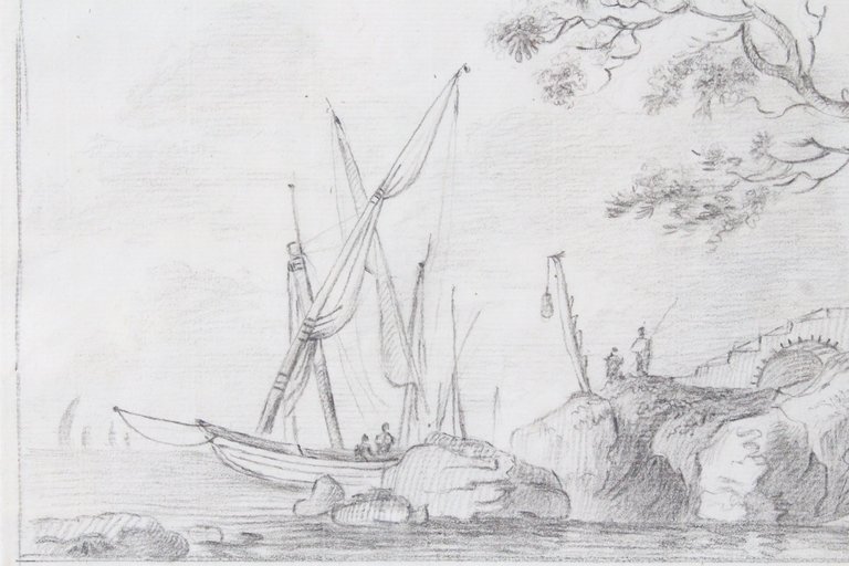 S. n. | s. l. (Circa 1776) | 40 x 50 cm | une feuille encadrée | Italian scene: animated seaside with square tower Original pencil drawing showing an animated seaside scene. Modern black wooden frame. A drawing done during the journey the artist undertook with Sade in 1776. Jean-Baptiste Tierce (1737-1794), who studied at the School of Fine Arts in Rouen and subsequently at the Academy of Painting and Sculpture in Paris, quickly built a reputation as a landscapist for his views of the South of France and Italy. His paintings are in the Uffizi in Florence and several French museums. When, in December 1775, Sade left Rome for Naples, he was welcomed by the son-in-law of his friend Dr. Mesny, Jean-Baptiste Tierce, who at the time was working on commissions for Cardinal de Bernis. He found lodgings for the Marquis who “intends to see everything [of the region], learn everything, judge, admire, critique, love, hate, in short give himself over to the insatiable and passionate curiosity that takes him to museums, galleries, churches, palaces and libraries as well as grottoes, caves, catacombs, and right down to the very innards of volcanoes. He was not content merely to look at the various works of art and ancient and modern monuments; he also set out to observe the local mores, politics, religion, administration, and social life. The beauty of the women, the local traditions, the quality of plays, table manners, and the way people drank, dressed, prayed, and made their way in the world all interested him. He wanted to take in both the present and the past of this culture, to encompass it all in a unique and universal vision. A massive undertaking to match his extraordinary imagination which he was, however, unable to fulfil, it being impossible for him to do so. This was, however, the nature of his central ambition as a writer: grandiose and outsized. With a view to this “great work”, Sade took hurried notes, at the side of the road or in hostelries, which he then complemented with notes from his correspondents Mesny and Iberti. Thus, he built up the monument he intended to put before the public, but which did not end up seeing the light of day until the 20th century. Jean-Baptiste Tierce was a close collaborator: he re-read Sade's notes and gave his observations on the little notebooks, with numbers referring to the works mentioned. Sade took the greatest notice of his views. Often, the painter accompanied him on his rambles, sketchbook in hand, drawing the buildings and landscapes before them. A hundred or so of these drawings and watercolors were recently found in the Sade family archives. They give the Voyage en Italie the charm of a real travel diary.” (Maurice Levert, Sade, pp. 283-284). Provenance : Sade family archives. * [FRENCH VERSION FOLLOWS] | Dessin original au crayon représentant une vue animée de bord de mer. Encadrement moderne de baguettes noires. Dessin réalisé pendant le voyage fait avec le marquis de Sade au cours de l'année 1776. Jean-Baptiste Tierce (1737-1794), élève à l'école des Beaux-arts de Rouen puis à l'Académie de Peinture et de Sculpture de Paris, se fit rapidement remarquer comme paysagiste pour ses vues du Sud de la France et de l'Italie. Ses tableaux sont conservés aux Offices de Florence et dans plusieurs musées français. Lorsqu'en décembre 1775 Sade quitte Rome pour Naples, il est accueilli par le gendre de son ami le Docteur Mesny, Jean-Baptiste Tierce, qui à cette époque reçoit les commandes du Cardinal de Bernis. Il trouve un logement au Marquis « [qui] entend tout voir [de la région], s'instruire de tout, juger, admirer, critiquer, aimer, haïr, bref se livrer sans frein à cette curiosité insatiable et passionnée qui le conduit aussi bien dans les musées, les galeries, les églises, les palais et les bibliothèques, que dans les grottes, les caveaux, les catacombes, et jusque dans les entrailles des volcans. Il ne se contente pas de contempler les œuvres d'art, les monuments antiques