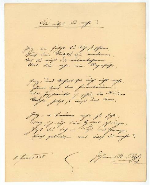 1 S. 4to. Herz, wie fühlst du dich so schwer, | Seit dein Liebstes dir verloren, | Das du einst dir auserkoren | Und dir nahm ein Ungefähr. | Herz, und kehrt sie auch nicht mehr, | Jene Zeit der Feenträume, | Die geschmückt so schön die Räume | Welche jetzt so wüst und leer; | Herz, o traure nicht zu sehr, | Mag sich auch Dein Himmel schwärzen, | Hast DU doch in Lust und Schmerzen | Einst geliebt, - was willst Du mehr? - J. N. Vogl gehörte der Literatengruppe im Wiener "Silbernen Kaffeehaus" an, wurde Mittelpunkt einer Tafelrunde von Künstlern und gab zahlreiche Almanache und Taschenbücher heraus; viele seiner in der Tradition der Wiener Spätromantik stehenden Balladen wurden von Carl Loewe vertont, einige Lieder auch von Franz Schubert.