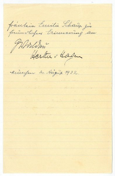 ½ S. 8vo. Gewidmet Emilie Schaup. - Waldau trat in die bayerische Armee ein, ließ sich dann jedoch zum Schauspieler ausbilden und debütierte 1897 in Köln. Mit Ausnahme einiger Gastspielreisen durch Amerika und Rußland spielte er am Münchner Staatsschauspiel und entwickelte sich zu einem bedeutenden Charakterdarsteller. Nach dem Zweiten Weltkrieg gehörte er längere Zeit dem Landestheater in Innsbruck an und übernahm kleinere Rollen im Film.