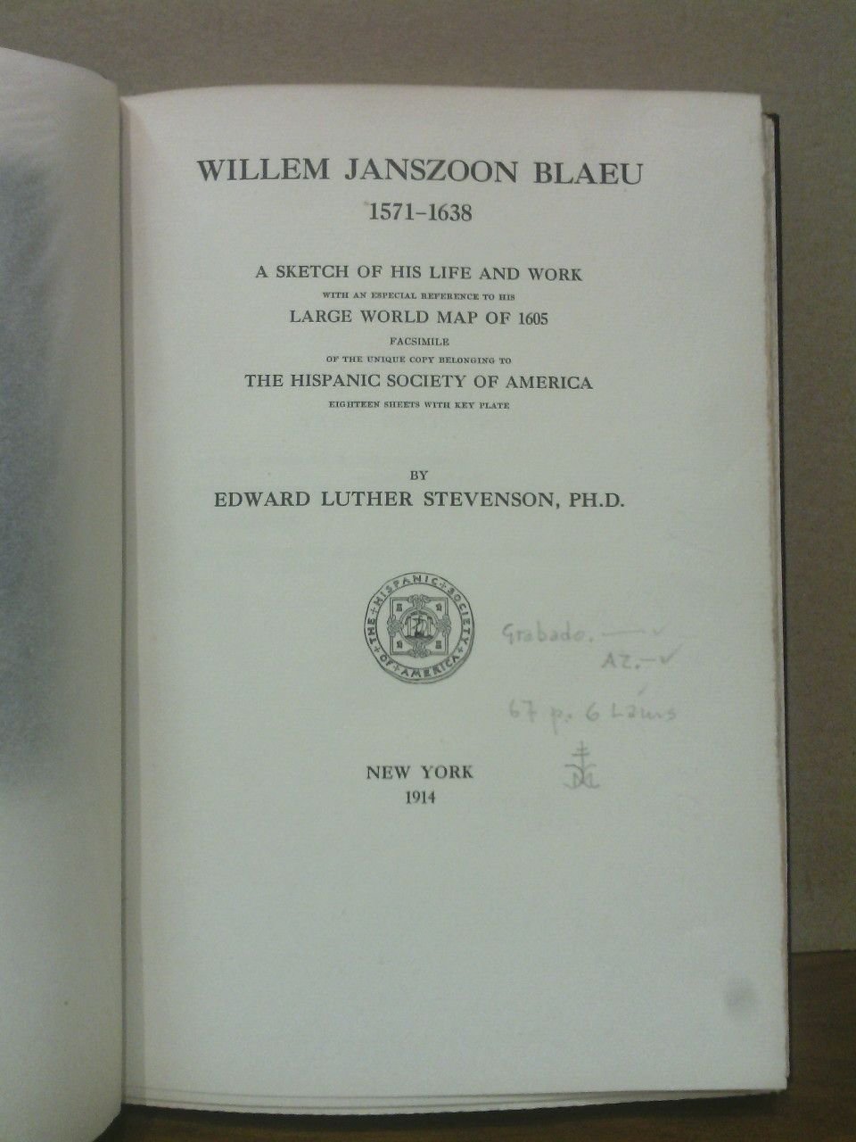 Willem Janszoon Blaeu, 1571 - 1638. A sketch of his life and work, with an especial reference to his Large World Map of 1605 facsimile of the unique copy belonging to The Hispanic Society of America, eighteen sheets with key plate