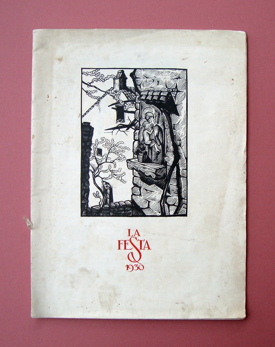 Calendario, La Festa 1930 s.d.t.; 1930; cm 33x24,5; pp. n.n; fascicolo rilegato con cordella con 13 xilografie originali di Aldo Petocchi. Testi di autori vari ( Provenzal, Ada Negri, Angelini.) Condizioni di conservazione Esemplare in buone condizioni con tracce del tempo;br. con bruniture, piccole macchiette e piccola abrasione; margini con qualche piccolo strappetto; interni buoni; xilografie perfette. SC03.D17567 blu
