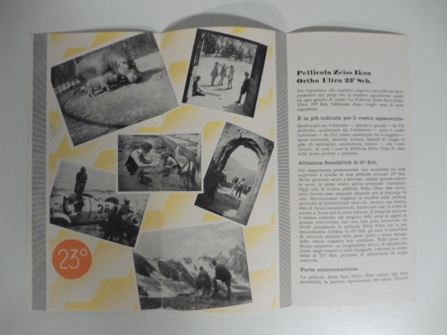 Pieghevole di 6 facciate (ciascuna misura cm 8,5 x 17,5) con foto in bianco/nero. Pieghevole pubblicitario della pellicola Zeiss Ikon Ortho Ultra 23 Sch. Non datato ma 1935 circa.