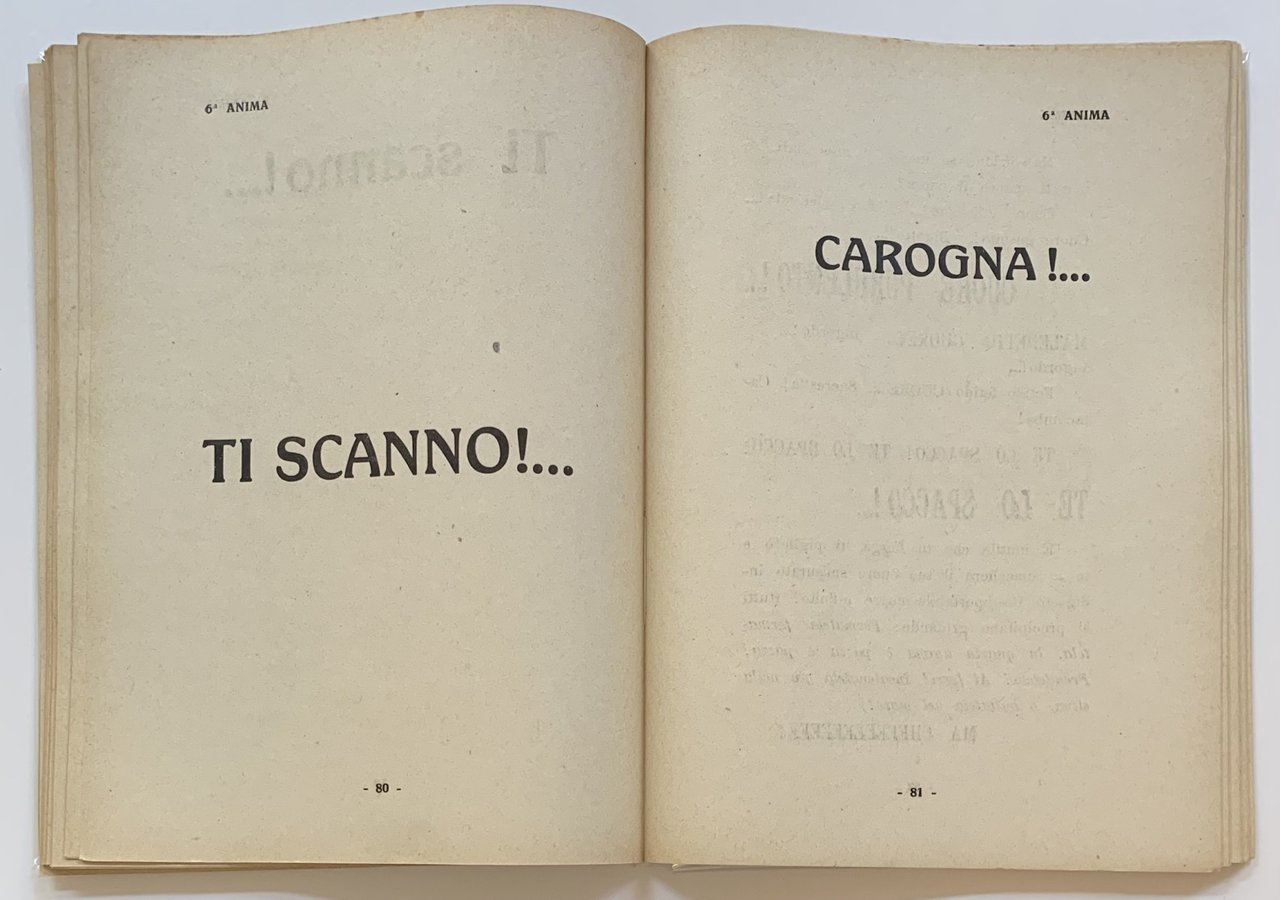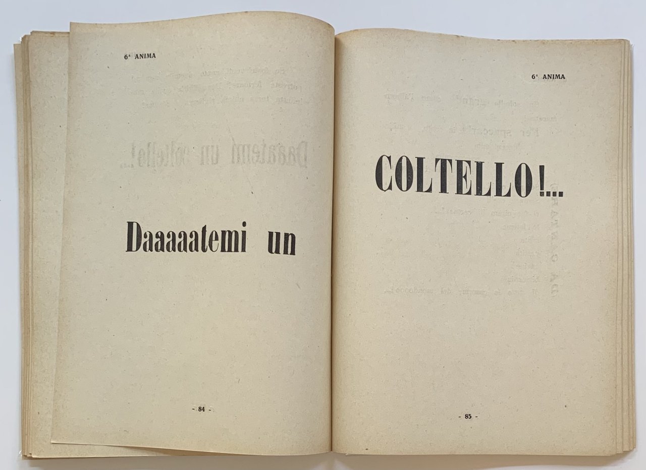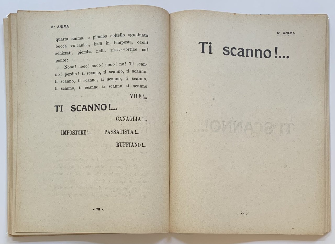 Stampato dallo Stab. Tipografico A. Taveggia di Milano nel maggio del 1919. In copertina una tavola parolibera in nero e rosso. Cm 21,5x15,5. pp. 144. . Ottimo (Fine). Piccolissima macchia scura all'angolo superiore della copertina anteriore. Per il resto un esemplare eccellente (Very small black stain on the upper corner of the front cover. Otherwise an excellent copy). Prima edizione (First Edition). Futurismo 1 [Salaris, 1988] Salaris Claudia, Bibliografia del futurismo. Roma, Biblioteca del vascello, 1988. Nel romanzo Marinetti descrive le sue 8 anime, dedicando a ciascuna un capitolo stampato in corpo e carattere differente.