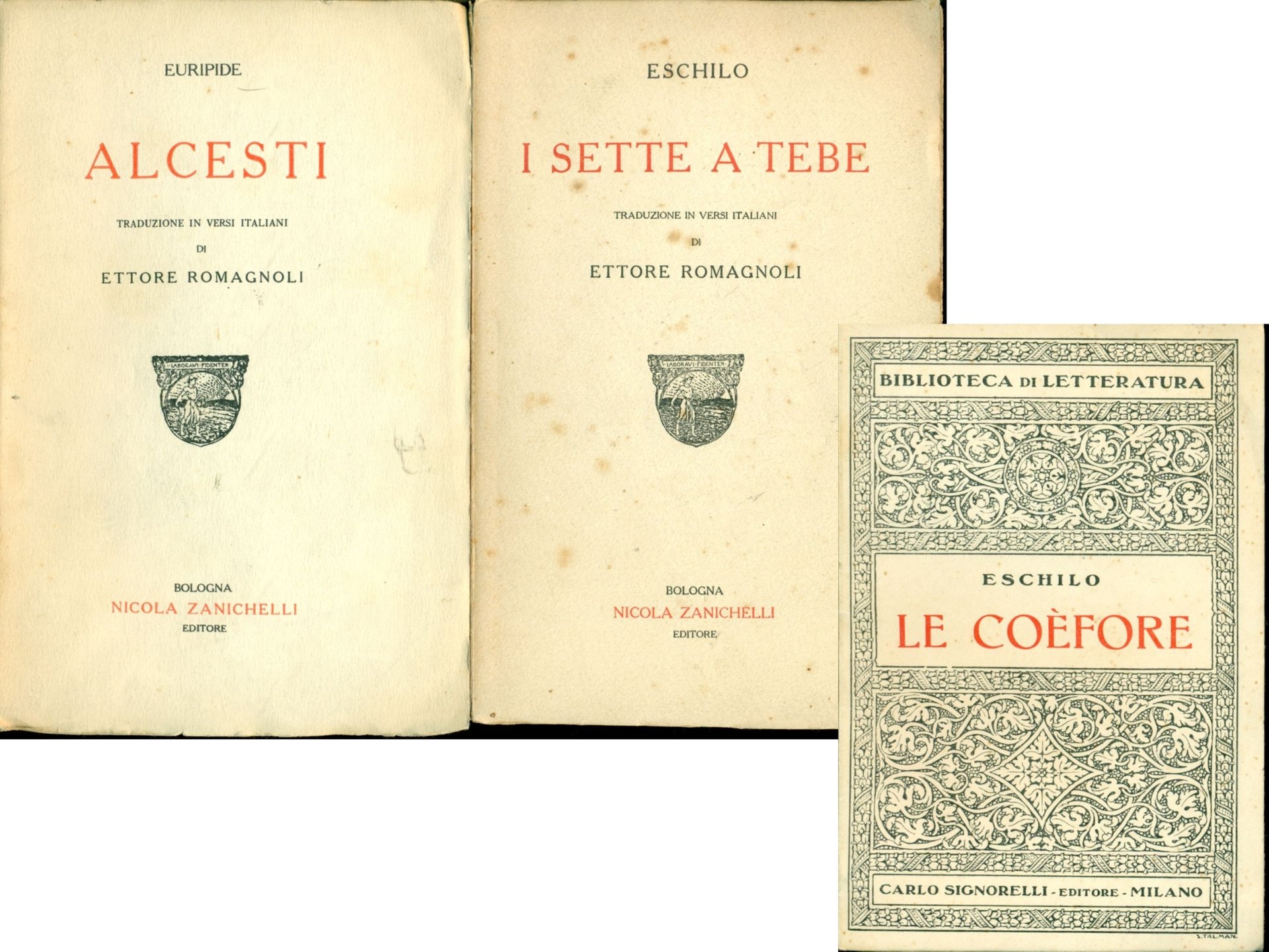 Traduzione in versi italiani di Ettore Romagnoli . 16mo. pp. 80. . Molto buono (Very Good). . . . Allegati 2 libri: Eschilo: I sette a Tebe, Zanichelli 1924 traduzione di E. Romagnoli e Eschilo, Le Coefore, Carlo Signorelli1951 traduzione di Antonio Marzullo
