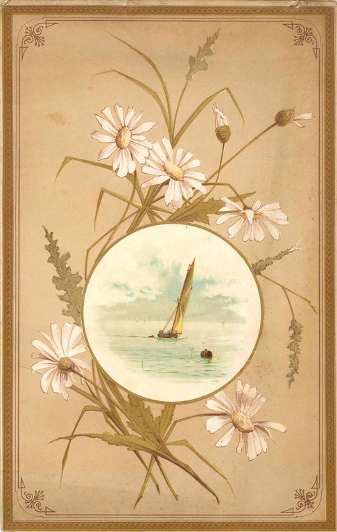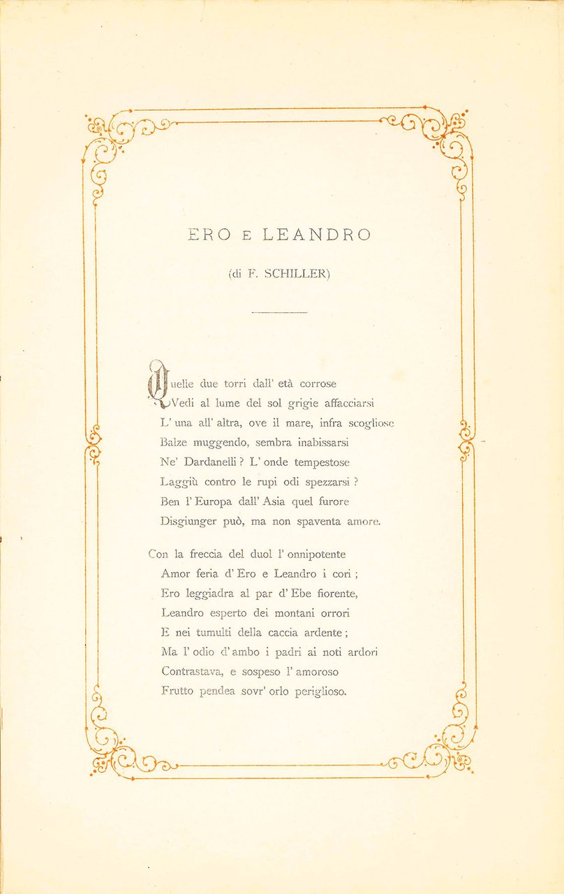 Mm. 310 x 195. Pp. 20. Brossura coeva riccamente illustrata con doppia cornice dorata, mazzo di margherite e veduta marittima entro tondo con iniziali J. N. D. (leggermente brunita, con fioriture e due fori di tarlo alla quarta di copertina). Dedica al padre della sposa Carlo Maluta, per felicitarsi delle nozze della figlia Maria avvenute in data 25 febbraio 1889, da parte dell'amico Pietro Prosperini. Segue una traduzione di Antonio Zardo, professore e un tempo maestro di Maria, della ballata Ero e Leandro originariamente composta da Friedrich Schiller.