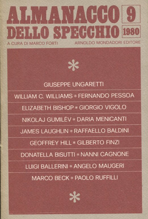 Con la collaborazione di Giuseppe Pontiggia. Comitato di lettura: Giansiro Ferrata, Giovanni Raboni, Vittorio Sereni. Poesie di: Giuseppe Ungaretti, William Carlos Williams (traduzione di Paola Forti), Fernando Pessoa (traduzione di Maria José de Lancastre), Elizabeth Bishop (Gabriella Morisco), Giorgio Vigolo, Nikolaj Gumilev (traduzione di Serena Vitale), Daria Menicanti, James Laughlin (traduzione di Mary de Rachewiltz), Raffaello Baldini, Geoffrey Hill (traduzione di Silvano Sabbadini e Janet Wing), Gilberto Finzi, Donatella Bisutti, Nanni Cagnone, Luigi Ballerini, Angelo Maugeri, Marco Beck, Paolo Ruffilli. Bibliografia poetica essenziale . 16mo. pp. 334. . Ottimo (Fine). . Prima edizione (First Edition). .