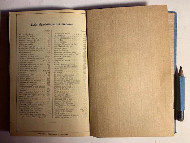 24me éd.. XXIV grande/ 288/ rilegatura rifinita in tela azzurro cielo con grafica in oro e nero. Compresa nella rilegatura la custodia per una matita (conservata) all'ultimo piatto. Fogli di guardia in carta écru (l'ultimo foglio di guardia con tasca). Con illustrazioni in nero, bianco e nero, seppia e a colori nel testo e f.t.. Sytato buono (leggera usura della copertina - pagine brunite - in frontespizio nome e indirizzo del proprietario negli appositi spazi e dedica tutti ad inchiostro nero).