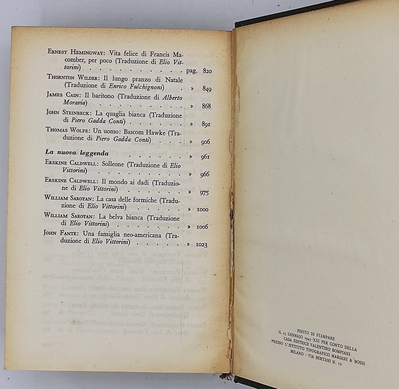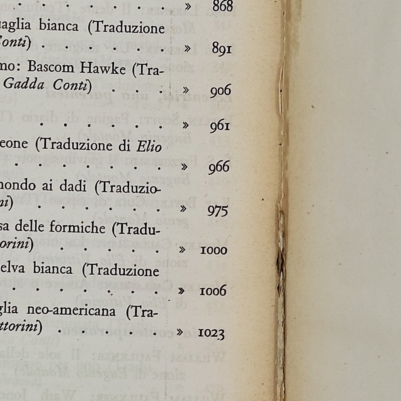 Famosa antologia curata da Elio Vittorini. Una prima stampa del 1941 venne mandata al macero per ordine di Corrado Pavolini, che non apprezzava né l'introduzione di Vittorini, né alcune delle altre scelte. La prefazione venne allora affidata ad Emilio Cecchi, mentre Vittorini dovette contentarsi di inserire delle nuove illustrazioni. Al frontespizio la data riportata è 1942, al colophon 25 gennaio 1943. Copia priva di sovracopertina. La copertina e l'interno mostrano brunitura data dal tempo. La legatura interna frontale è danneggiata (vedere foto). Pagine prive di strappi, sottolineature o pieghe.