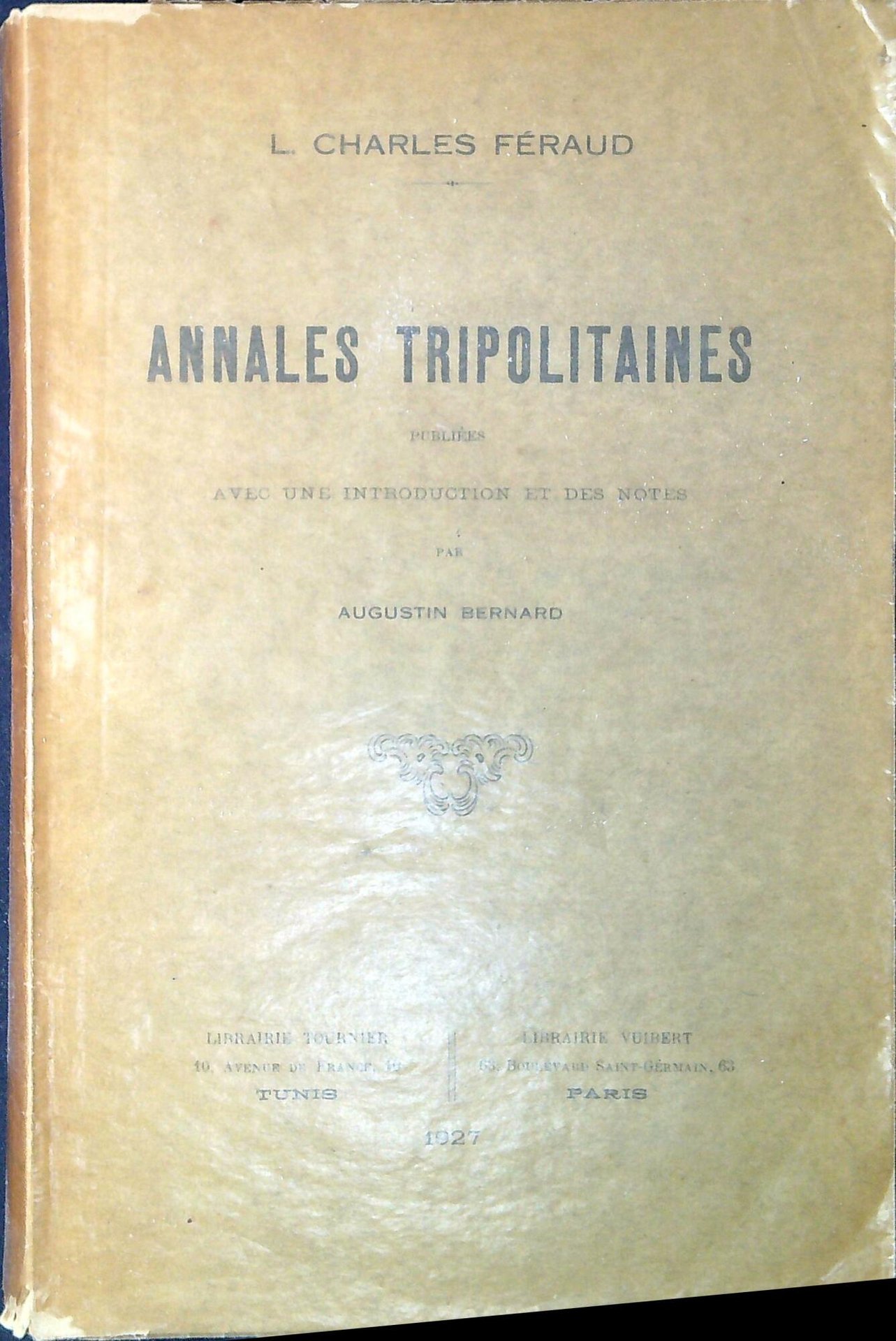 L. Charles Féraud ; publiées avec une introduction et des notes par Augustin Bernard Annales tripolitaines. Tunis, Librairie Tournier ; Paris : Librairie Vuibert 1927, XIX, 478 p. ; 25 cm. (74003)