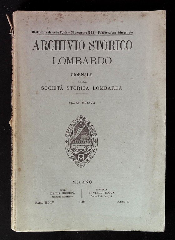 in 8° grande, bross. ed. pp. 278 - 531 Parte Seconda, coll. Archivio Storico Lombardo / Serie Quinta / Fascicoli n° III-IV / Anno 1923-L Illustrazione col. f.t. ripiegata Stato di conservazione della coperta mediocre, interni in ottimo stato (A26)