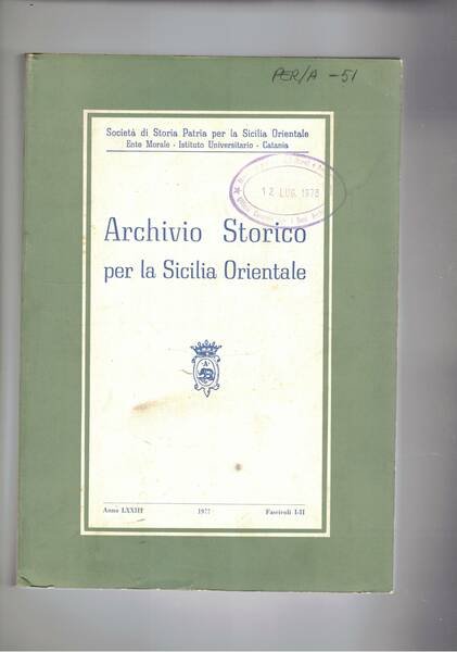 Archivio storico per la Sicilia Orientale fasc. I-II in unico vol. di tre 1977. I visitatori generali della Sicilia sec. XVI-XVII; Dusmet a Catania, chiesa e movimento cattolico; letteratura catanese tra le due guerre; il catalogo della biblioteca Biscari; movimento migratorio nel ventennio fascista; ecc.
