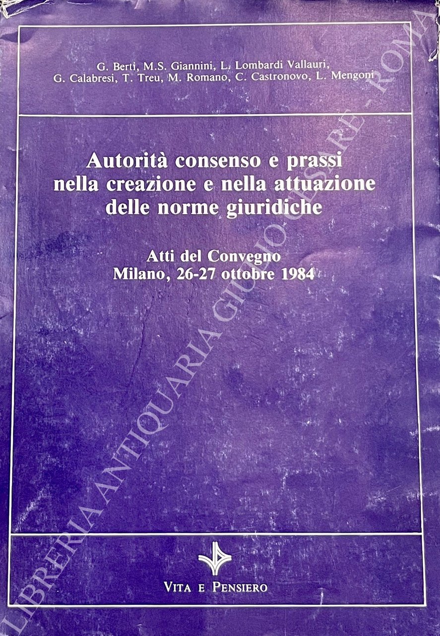 Autorità consenso e prassi nella creazione e nella attuazione delle norme giuridiche. Atti del Convegno Milano, 26-27 ottobre 1984 | Libros antiguos y modernos | Berti G. - Giannini M.S. - Mengoni L. - Romano M. Et Alii
