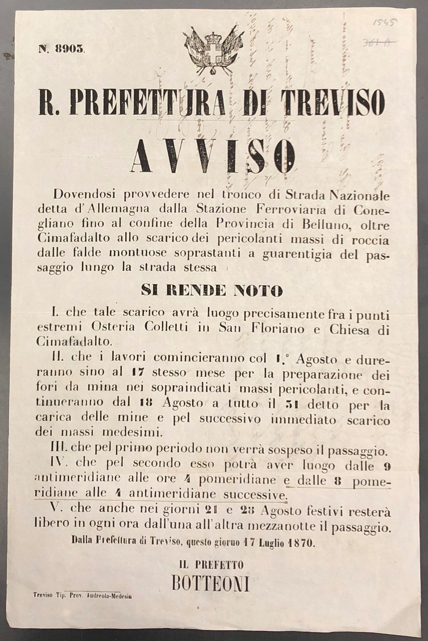Avviso. R. Prefettura di Treviso. Comunicazione di inizio lavori in vista dello scarico dei massi pericolanti che si trovano nel tratto che va dalla Strada Nazionale detta d'Allemagna fino al confine della Provincia di Belluno | Libros antiguos y modernos | Provincia Di Treviso - Botteoni