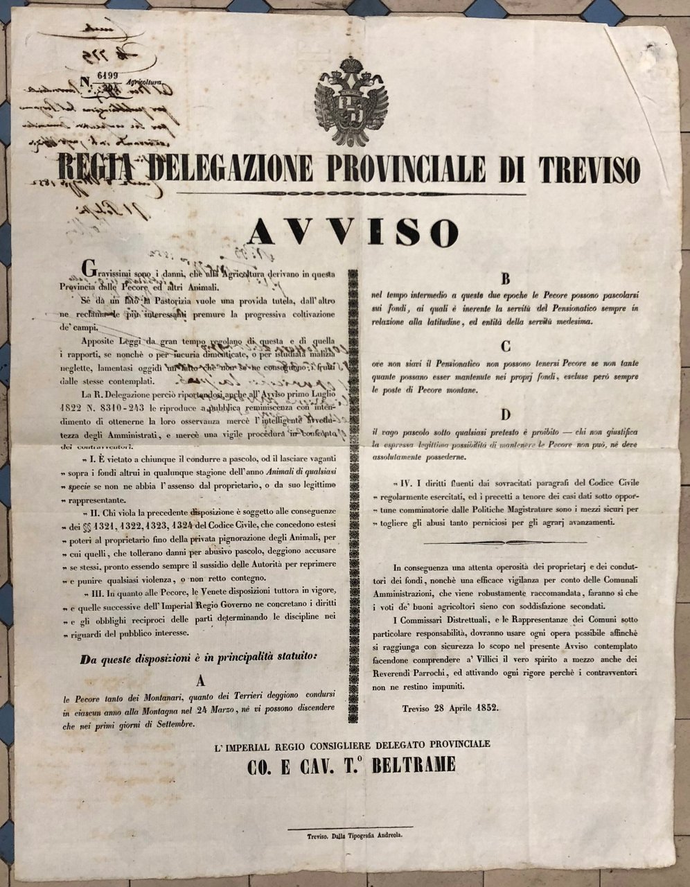 Avviso. Regia Delegazione Provinciale di Treviso. Regolamentazione del pascolo delle pecore e di altri animali per preservare i terreni agricoli