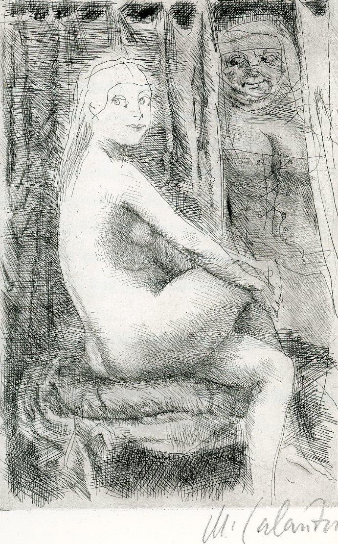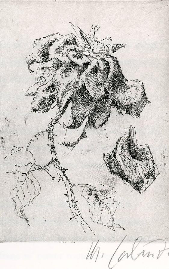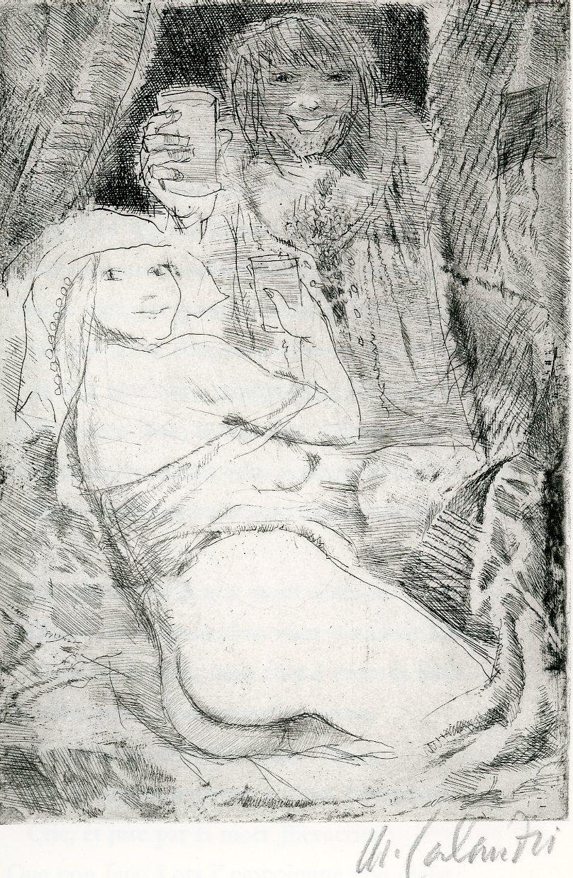 6 acquaforti originali di Mario Calandri di cui 4 a piena pagina numerate e firmate (cm 17,6x12; 9,4x4,7) e 2 piccole, di cui una al frontespizio non firmata (cm 4,5x5,3) Bella carta marmorizzata ai piatti. Titolo in oro al dorso. Folio. pp. 92. . Perfetto (Mint). . Edizione originale di 125 esemplari. .