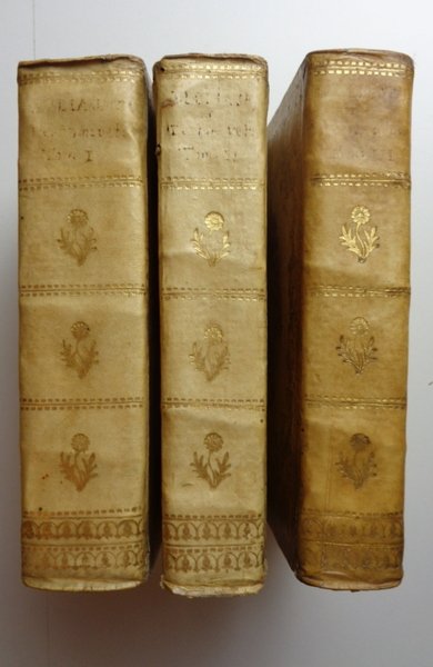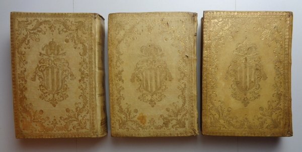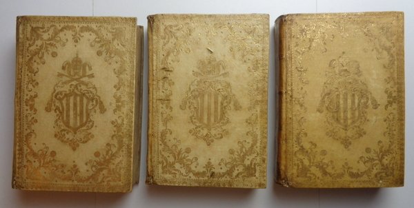 .Sixti V. Pontificis Max. iussu recognita, et Clementis VIII. auctoritate edita, versiculis distincta et ad singula capita argumentis indicibusque aucta; pluribusque imaginibus, ad historiarum notitiam politissime elaboratis, ornata. Tre volumi (14x20 cm). Pars prima: (30)-623pp; Pars altera: 560pp; Novum Jesu Christi Testamentum: 591 pagine, con indice manoscritto di 2pp in fine. Antiporta incisa del Piazzetta al vol 1, numerose incisioni di dimensioni varie (circa un terzo di pagina) lungo tutti e tre i volumi. LEGATURA in tutta pergamena con doppia cornice dorata ai piatti, decori floreali in ovale a inquadrare ai piatti lo stemma dorato di PAPA BENEDETTO XIV. Dorso liscio con fregi dorati a margherita e ai piccoli ferri, traccia di titolazione manoscritta. Al piatto anteriore del vol 3 piccoli tagli; qualche altra traccia d'uso, peraltro condizioni molto buone. Esposto alla Mostra La rilegatura d'arte antica pontificia (Museo civico di Albano, 1988).