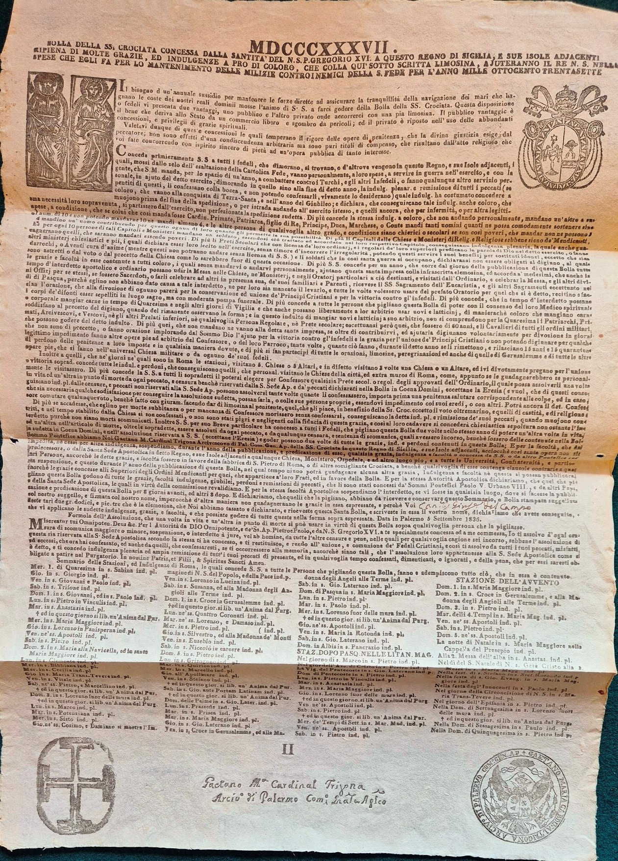 Emessa a nome del Papa Gregorio XVI, ma firmata dal Cardinale Gaetano Maria Trigona - In folio - pp.1 - Non rilegato - Reperto storico di grande fascino che serviva a raccogliere fondi per le necessità dello Stato e della Chiesa in cambio di indulgenze spirituali.