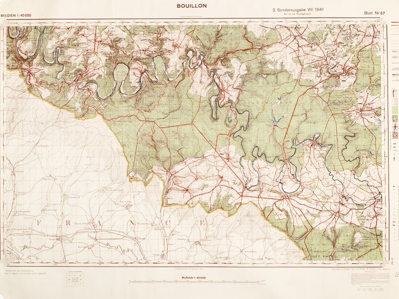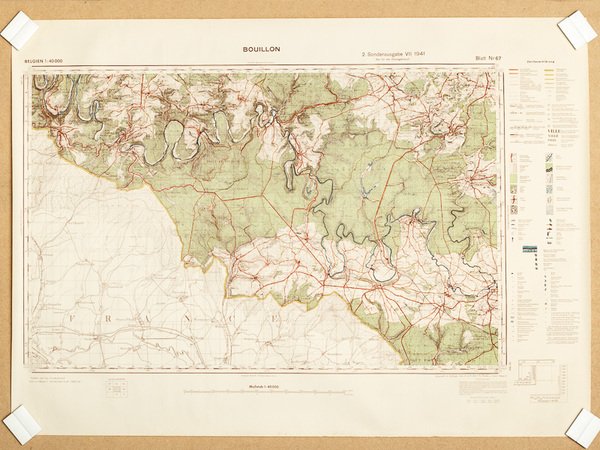 Map size 72 x 99 cm, 1/40.000, Hergestellt im Auftrage Gen. St. d. H. Abt. f. Kr. Karten u. Verm. Wesen II, VII 1941 Fine original map, used by the german military forces (Wehrmacht or Luftwaffe) during World War II. Très bon état pour cette belle grande carte d'état-major couvrant toute la région de l'est de Bouillon, en Belgique, et exclusivement réservée à l'usage des troupes militaires allemandes lors de la Seconde Guerre Mondiale. Les couleurs sont parfaitement conservées.