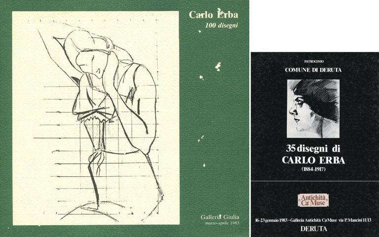 Catalogo di mostra, Roma, Galleria Giulia, marzo-aprile 1983. Un testo di Enrico Crispolti. Illustrazioni in bianco e nero. Elenco dei disegni. Bibliografia . 8vo. pp. 44. . Ottimo (Fine). Piccole abrasione in copertina (Small damage to cover). . . Si aggiunge un secondo catalogo dell'Artista: 35 disegni di Carlo Erba (1884-1917. Testo di Enrico Crispolti e 12 illustrazioni. Galleria Ca' Muse, 1983