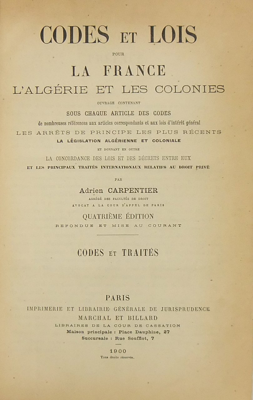 Codes et lois pour la France, l'Algerie et les Colonies. Ouvrage contenant sous chaque article des code de nombreuses referencesaux articles correspondants et aux lois d'interet general. | Libros antiguos y modernos | Carpentier Adrien