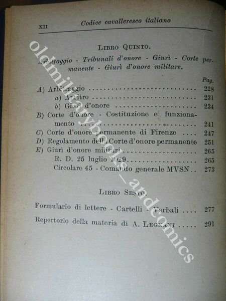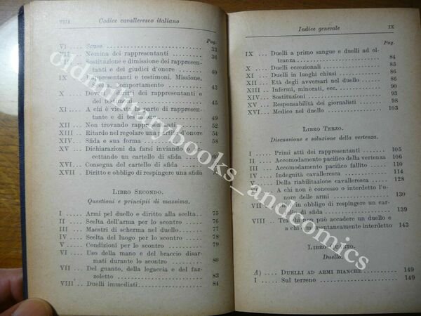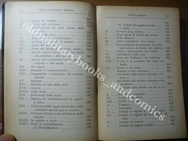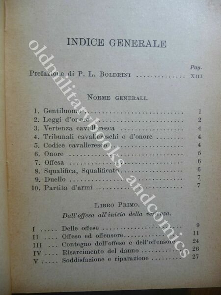 DESCRIZIONE: Hoepli Ed. Milano 1932 XVII^ Ed. br. ed. ca. pp. 334 in 16°. Manuale del Codice Cavalleresco Italiano, scritto dal Gelli dopo un'accurato studio sulle consuetudini cavalleresche italiane, cercando di creare una sintesi facilmente comprensibile a tutti, il testo è suddiviso in sei libri, dopo una parte sulle norme generali dove vengono illustrati i concetti morali di base come: l'onore, l'offesa, il duello, le leggi d'onore, la vertenza cavalleresca ecc., ciascuno dei libri affronta tematiche inerenti le pratiche di duello: dall'offesa all'inizio della vertenza, alle questioni e principi di massima, discusione e soluzione delle vertenze, il duello vero e proprio, l'arbitraggio, e il formulario di lettere e verbali. CONDIZIONI: Ottime. PESO / WEIGHT: 300 gr. without package