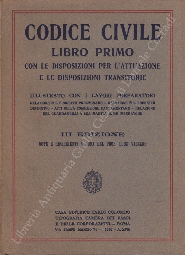 Codice civile. Libro primo. Con le Disposizioni per l'attuazione e le Disposizioni transitorie. Illustrato con i lavori preparatori. Relazione sul progetto preliminare. Relazione sul progetto definitivo. Atti della Commissione Parlamentare. Relazione del Guardasigilli a sua Maestà il Re Imperatore. Note e riferimenti a cura del Prof. Luigi Vaccaro