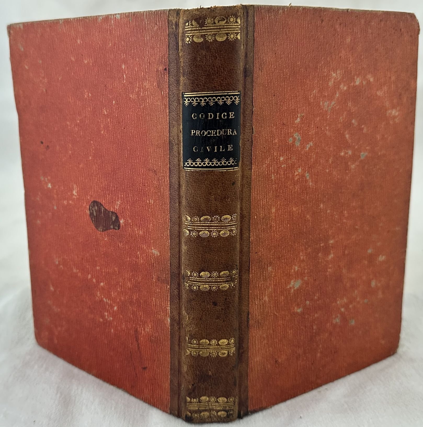Prima edizione originale ed ufficiale del 1819 del Codice per il Regno delle due Sicilie. L'opera era composta da sei parti, siamo in possesso solo della parte terza sulle leggi della procedura nei giudizi civili. Timbro dell'antico proprietario al frontespizio. In buone condizioni. Copertina in mezza pelle con titolo e decorazioni in oro al dorso in buone condizioni con lievi usure marginali. Legatura in buone condizioni. Pagine in buone condizioni con fioriture. Piccoli segni di inchiostro al margine inferiore delle pagine dalla 133 alla fine senza perdita di testo. In 8. cm. 20,5x13. Pp. (16)+256+XVI.First original official edition of 1819 of teh Code for Regno delle due Sicilie. The work was made up of six parts, we only have the third part about the laws for civil trials. Stamp of the ex owner in the title page. In good conditions. Half leather coeval cover with gilted title and decorations in the spine in good conditions lightly worn in the extremities. Binding in good conditions. Pages in good conditions with foxing. Little ink stains in the foot edge of pages from 133 to the end with no loss of text. In 8. cm. 20,5x13. Pp. (16)+256+XVI.