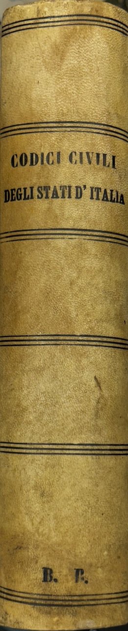 Collezione completa dei moderni Codici civili degli Stati d'Italia secondo l'ordine cronologico della loro pubblicazione. Contenente: Il Codice civile del cessato Regno d'Italia; Il Codice civile generale Austriaco pel Regno Lombardo-Veneto; Il Codice pel Regno delle Due Sicilie, Parte 1°, Leggi civili; Il Codice civile per gli Stati di Parma Piacenza e Guastalla; Il Codice civile della Repubblica e Cantone del Ticino; Il Codice civile per gli Stati del Re di Sardegna; Le Leggi civili per l'Isola di Sardegna. Aggiuntivi Il Codice Estense ossia Codice di leggi e costituzioni pel Ducato di Modena nelle parti relative alle materie civili.