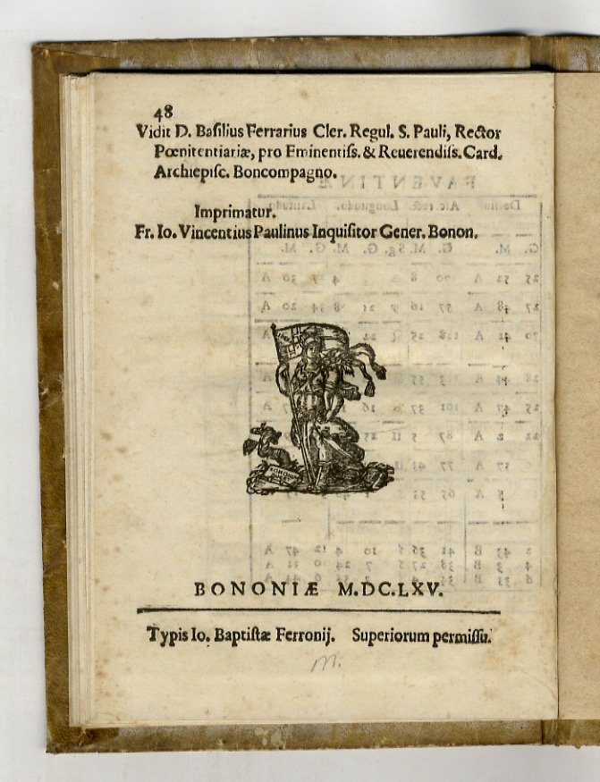 Bononiae, typis Io. Baptistae Ferronij, 1665, in-4 piccolo, legatura in piena pergamena floscia (la pergamena è coeva ma la legatura è stata rimontata con sguardie che, se pur in carta antica, non sono quelle originali), pp. 48. Con una tavola in calcografia più volte ripiegata. In fine sono ripetuti i dati editoriali, con una marca in xilografia. Prima edizione di questa rara relazione del passaggio della cometa su Bologna il 16 settembre 1664: la tavola mostra la traiettoria della cometa - che è anche raffigurata in basso, con la sua lunga coda - e il suo passaggio attraverso alcune costellazioni tolemaiche, registrato in numerose posizioni diverse, delle quali vengono date, in una tabella, anche la longitudine e latitudine. Ivano Dal Prete per il Dizionario Biografico degli Italiani: "Nel 1664 [il Montanari] osservò l’apparizione della grande cometa utilizzando un telescopio e un reticolo filare di propria costruzione. La misura della parallasse, e quindi della distanza dalla Terra, gli consentì di porre la cometa ben al di là della Luna, contro le concezioni aristoteliche che consideravano le comete un fenomeno sublunare (Cometes Bononiae observatus, Bononiae 1665). Tuttavia, egli non riteneva probabile che si trattasse di corpi stabili soggetti a ritorni periodici, vedendovi piuttosto momentanee condensazioni dell’etere interplanetario, un’opinione che non verrà scossa nemmeno dalle osservazioni delle grandi comete del 1680-82". Gemignano Montanari fu, da giovane, in stretti rapporti con il matematico fiorentino P. del Buono, uno degli ultimi allievi di Galileo che lo iniziò a un approccio in filosofia naturale tipico della scuola galileiana e dell’Accademia del Cimento. La sua attività nel campo astronomico si esercitò in rami diversi: effemeridi, osservazioni di comete, di stelle variabili, teorie planetarie e solari. Per primo segnalò nel 1668 la variabilità della stella Algol, fondamentale inizio del moderno studio sistematico delle variazioni di splendore delle stelle. Nelle sue frequenti polemiche demolì con vigore parecchie dottrine antiquate: prima tra tutte quella delle influenze astrologiche. Riccardi II, 170.