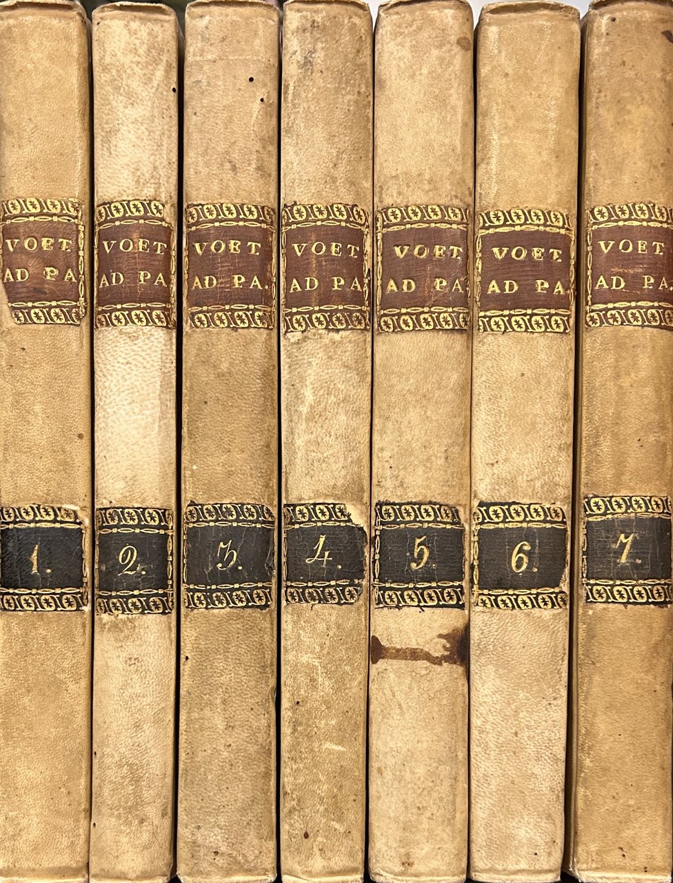 Commentariorum ad Pandectas libri quinquaginta, in quibus, praeter Romani Juris principia ac controversias illustriores, Jus etiam hodiernum, & praecipuae Fori Quaestiones excutiuntur. Editio quinta veneta prioribus emendatior et auctior cui nempe praeter C. Burmanni Vitae Auctoris Narrationem & Indicem Generalem Titulorum & Materiarum in sex tomis contentarum, nunc primum accedit. Vol. I; Vol. VII - Continens duos alios libros de Familia erciscunda, et De Jure Militari. | Libros antiguos y modernos | Voet Joannis (1647-1713)